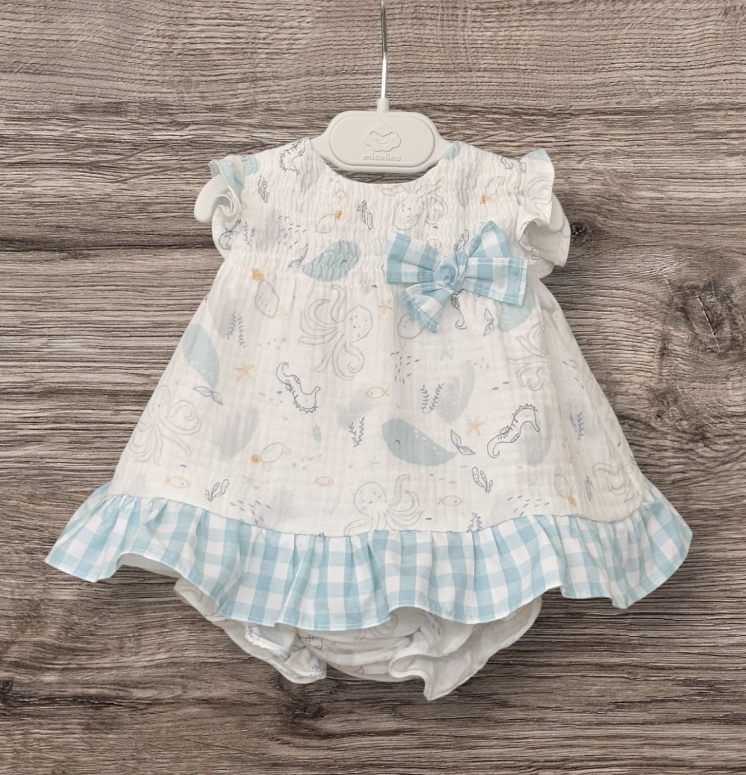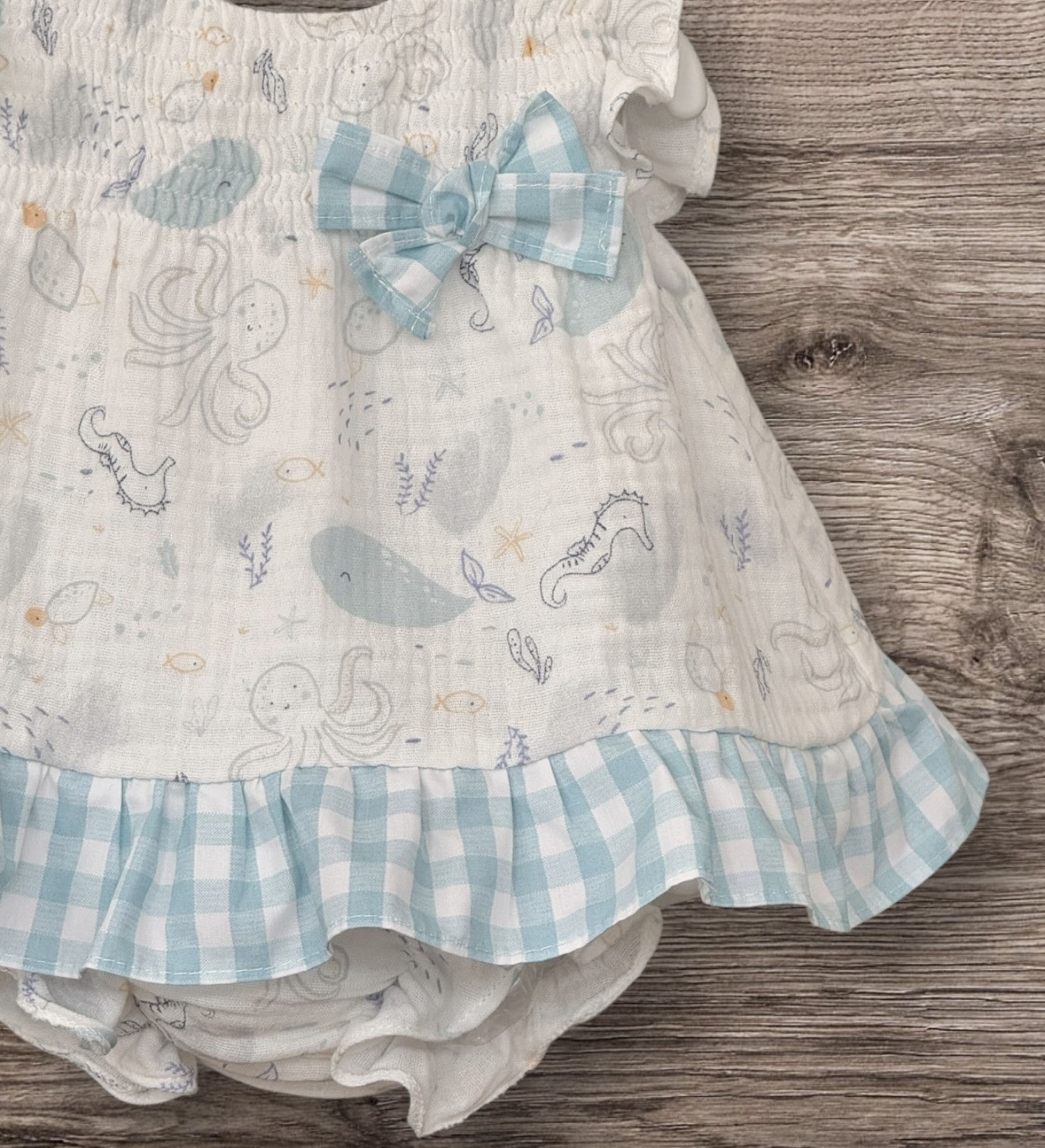 Jesusito de bambula blanca con estampado fondo marino en color turquesa. Tiene un bonito lazo como detalle a juego con el volante del bajo y la braga vichy en los mismos tonos.