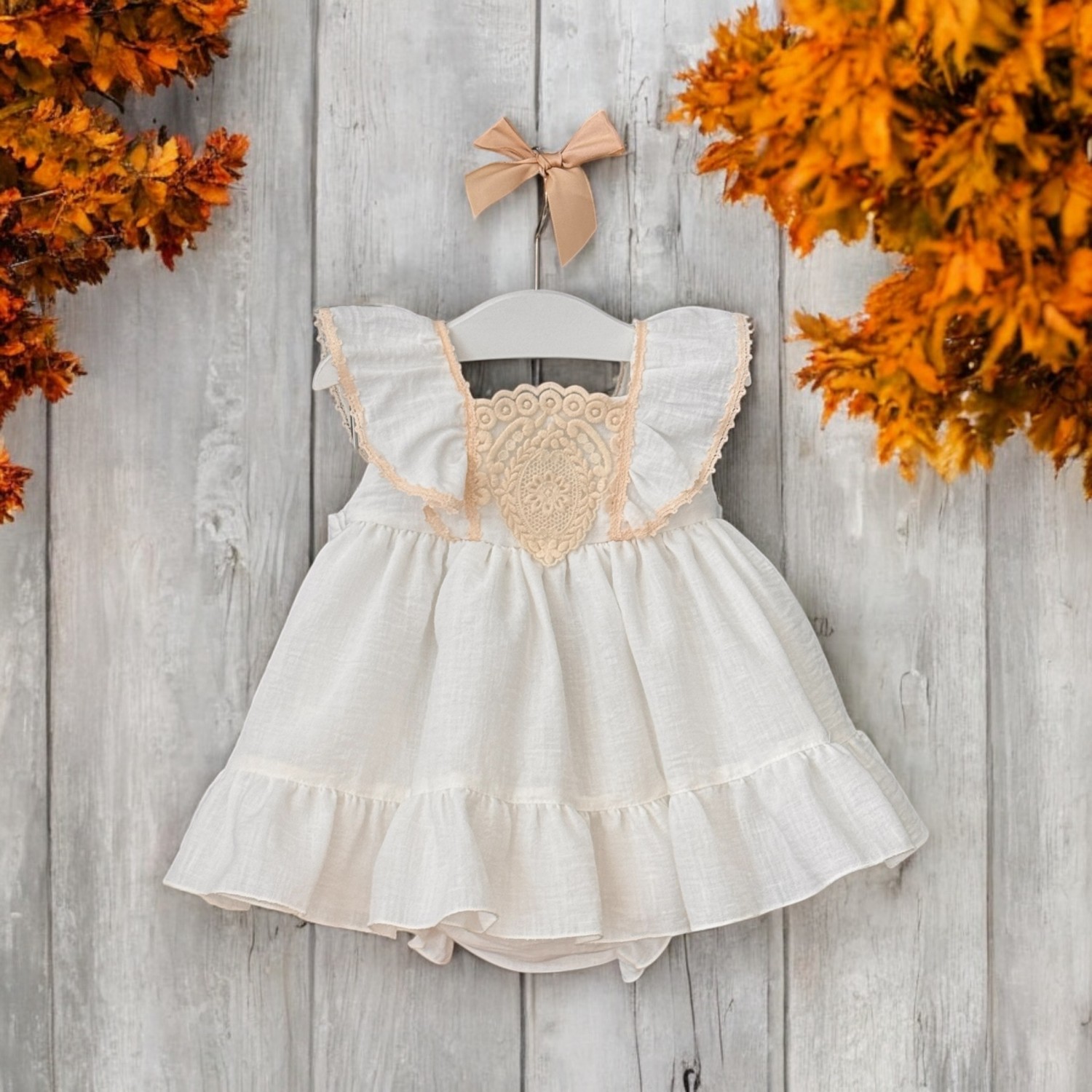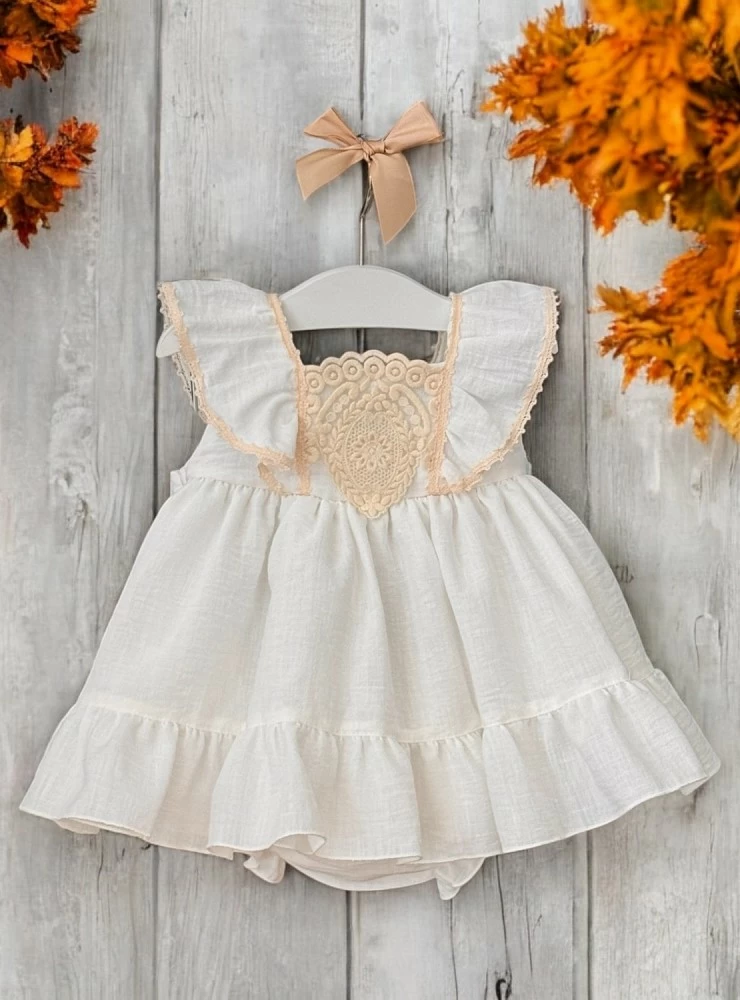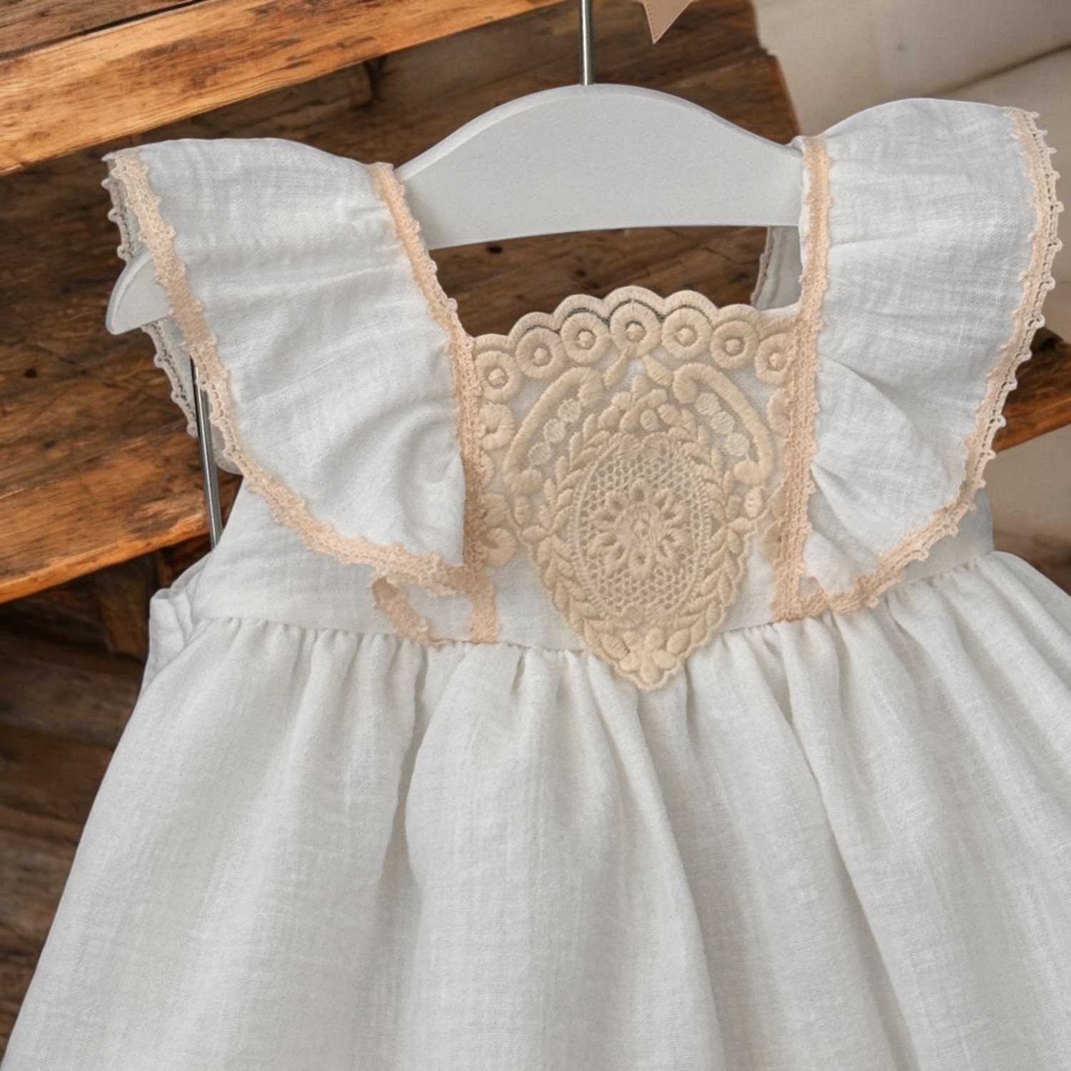 Confeccionado en Bambula de lino color beige. Con puntilla en el pecho de tul bordado en color beige un poco mas oscuro, lazo en espalda con el mismo tejido. Lleva varias capas de forro para darle volumen. Perfecto para cualquier evento.