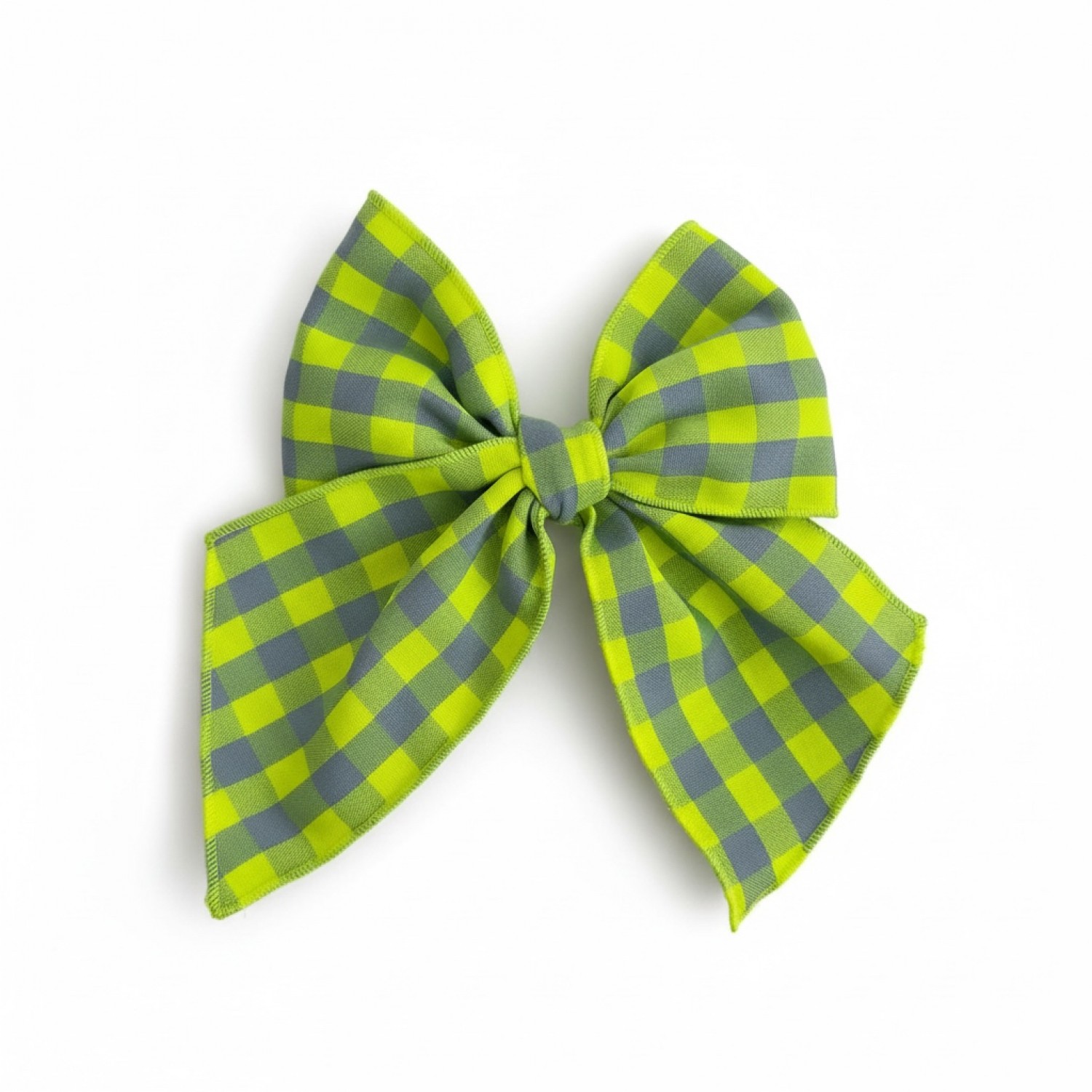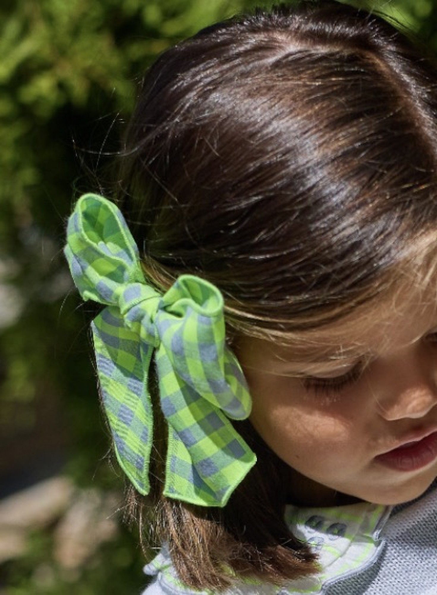 Lazo con pinza pico pato colección Pescardinos en estampado de cuadro vichy verde lima y gris.