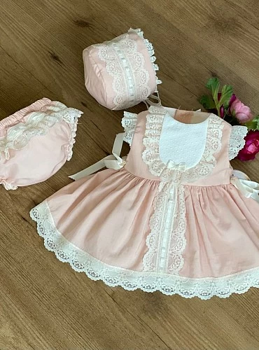 Conjunto Vestido y capota tul bordado con lazo rosa