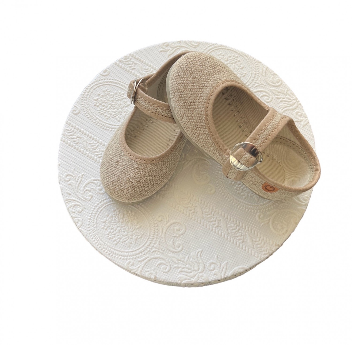 Confeccionada en lino con suela de goma. Lleva hebilla japonesa que se regula fácilmente y se adapta a cualquier pie