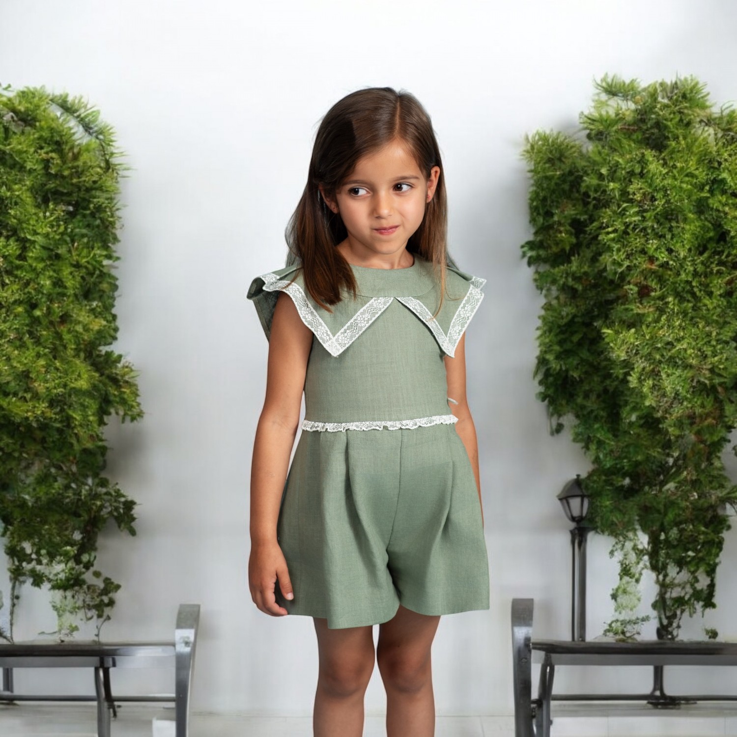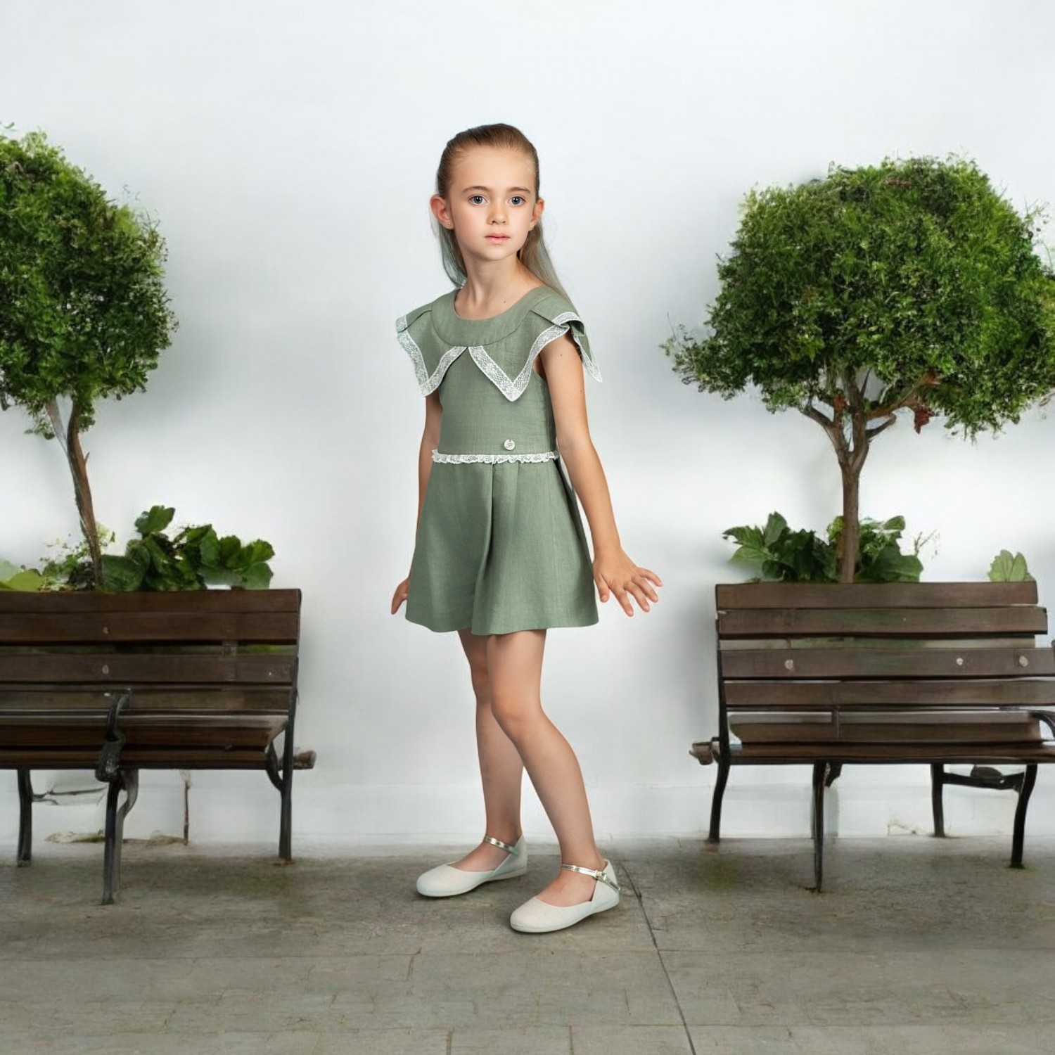 Destaca por su elegante cuello marinero con delicadas aplicaciones de encaje, aportando un aire clásico renovado.
