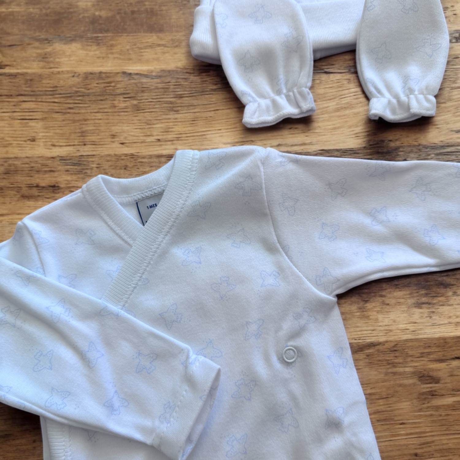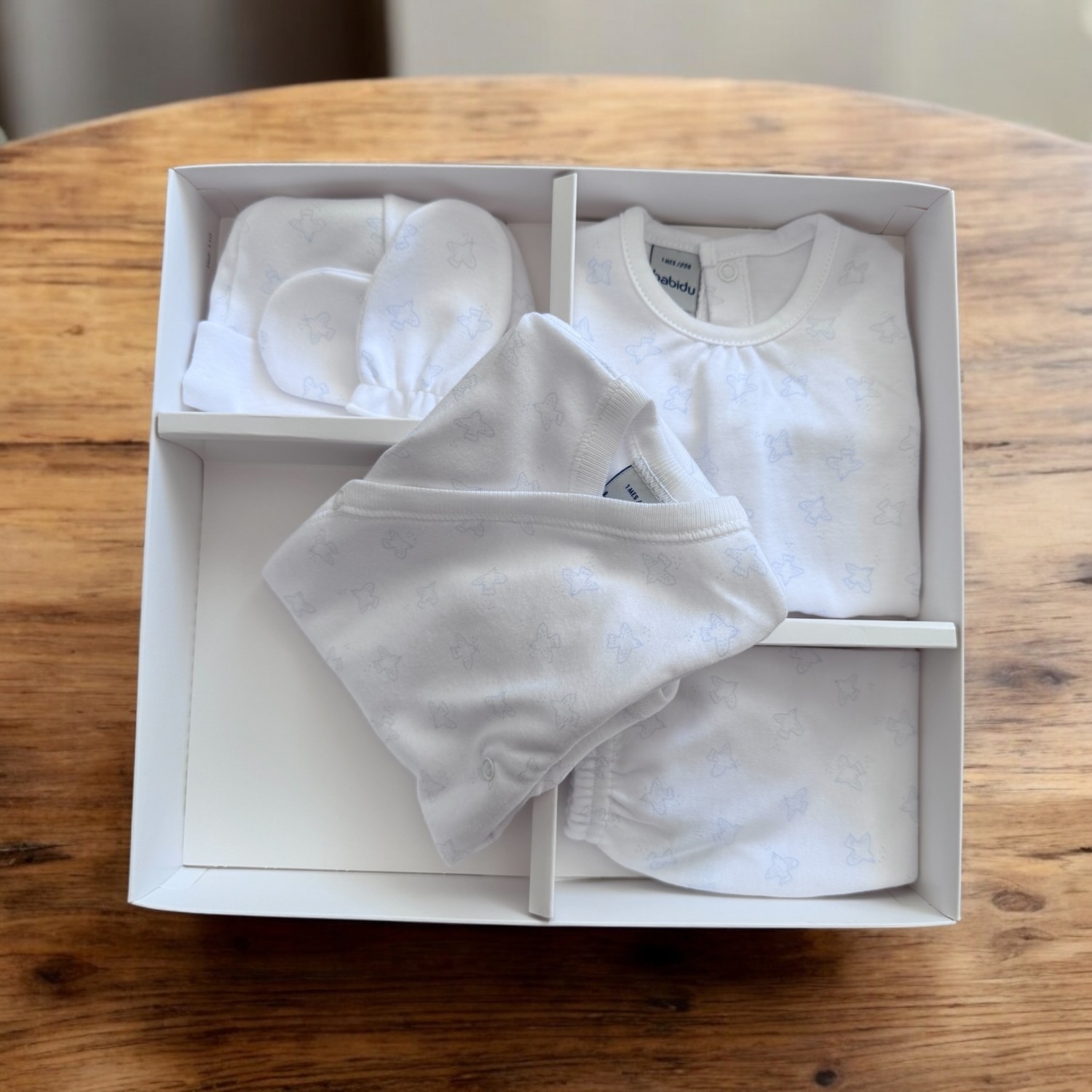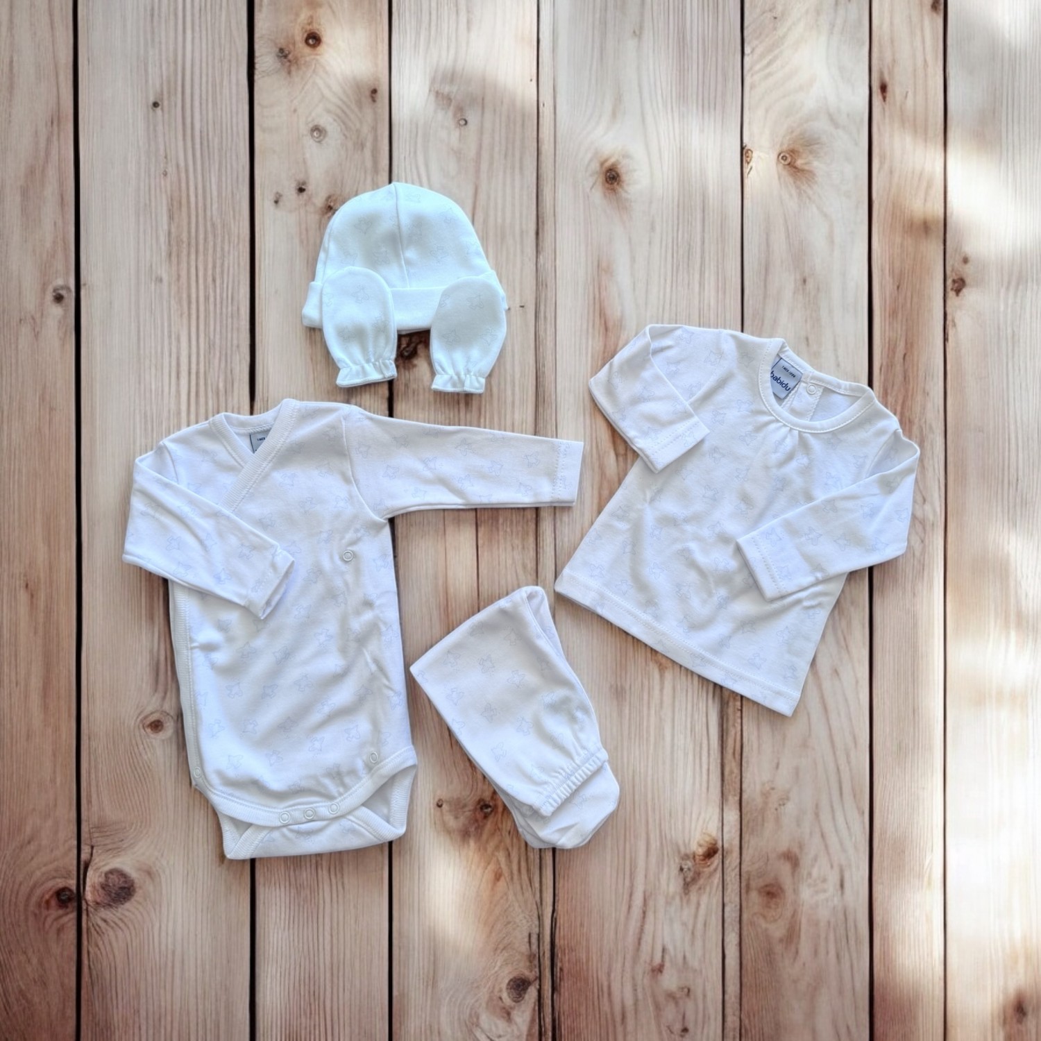 Compuesto por jubón, polaina, body, gorrito y manoplas