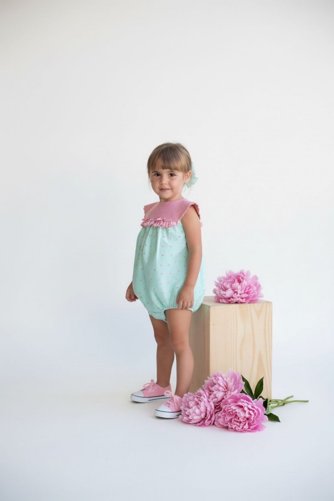 Pelele de niña en tejido ligero de verano en tono verde agua, con delicado estampado de pequeños motivos florales en color rosa distribuidos por toda la prenda.