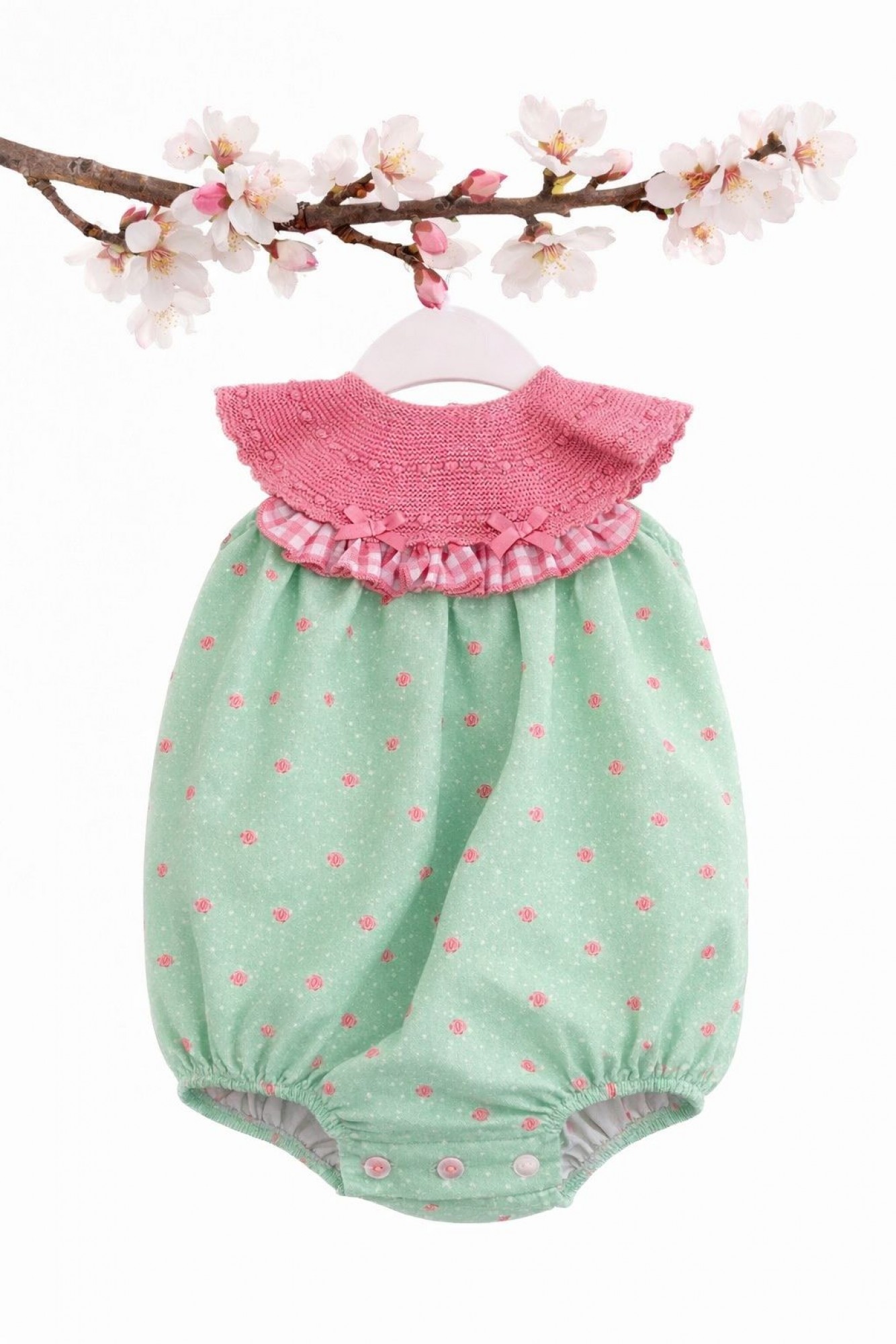 Destaca su canesú superior de punto en color rosa, trabajado con detalle y acabado en volante de vichy rosa y blanco, adornado con pequeños lazos decorativos que aportan un toque muy dulce.