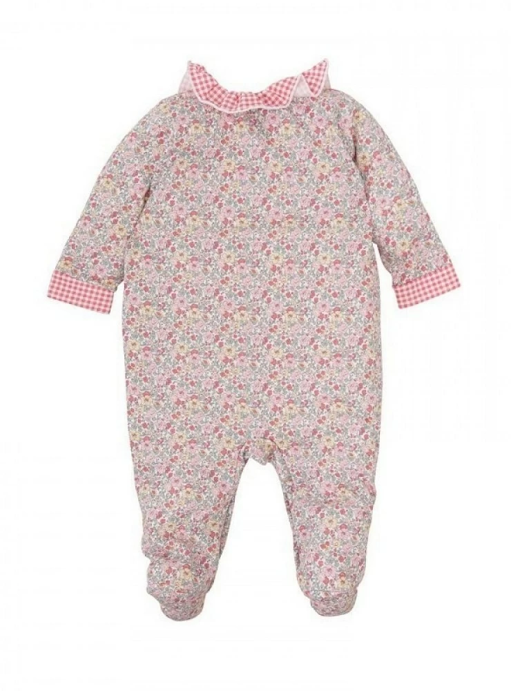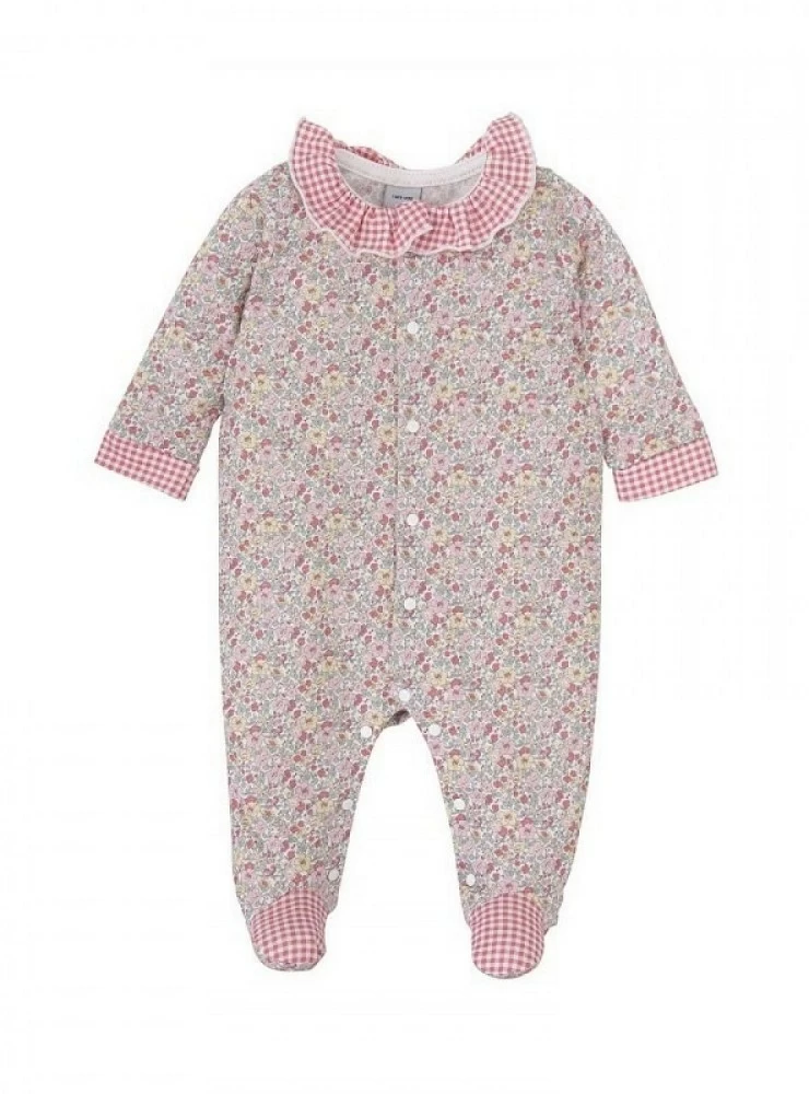Pelele para niña en color unico elaborado con el mejor algodón en cuadros vichy y flores liberty con tonos rosa y fucsia.