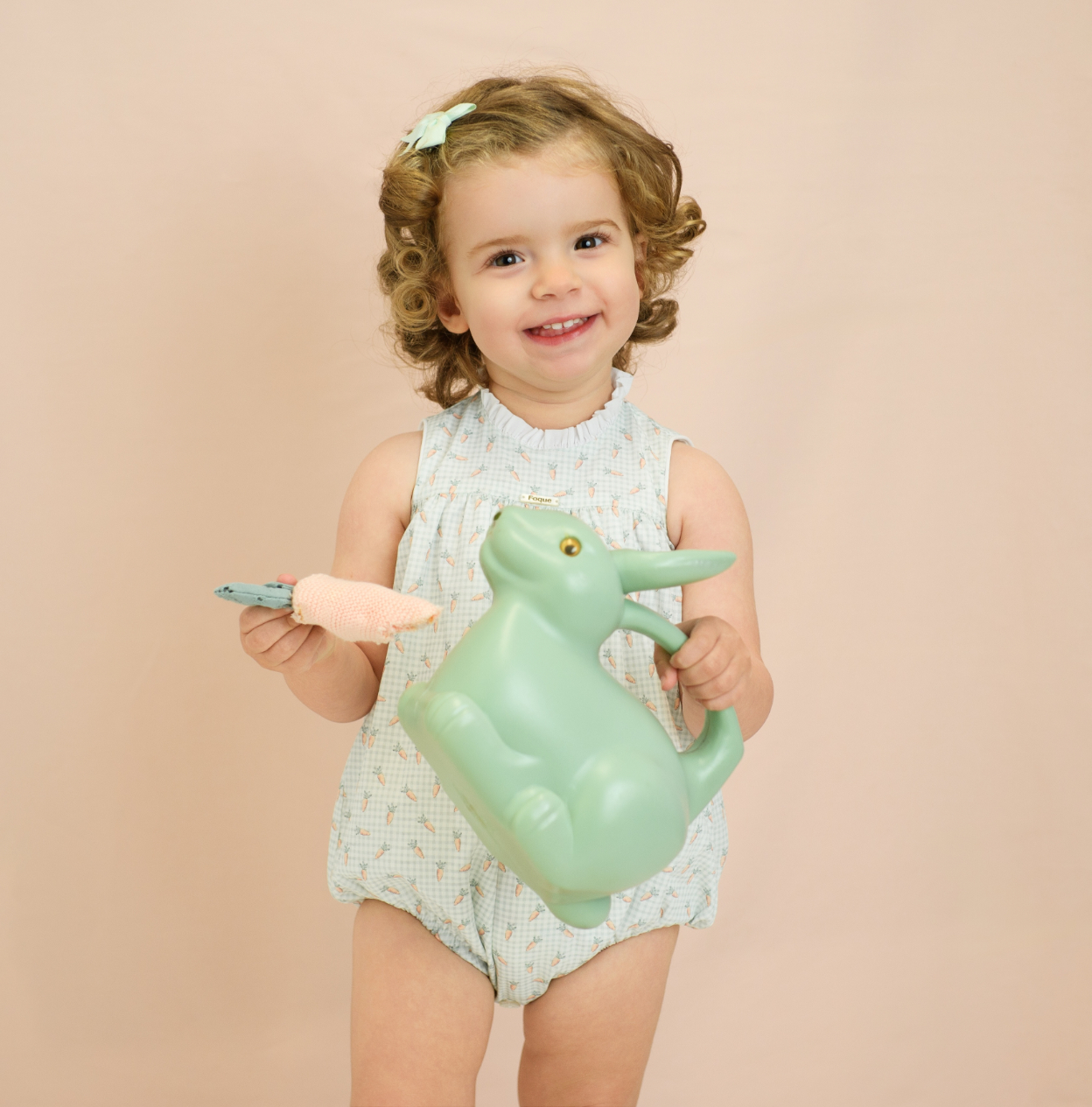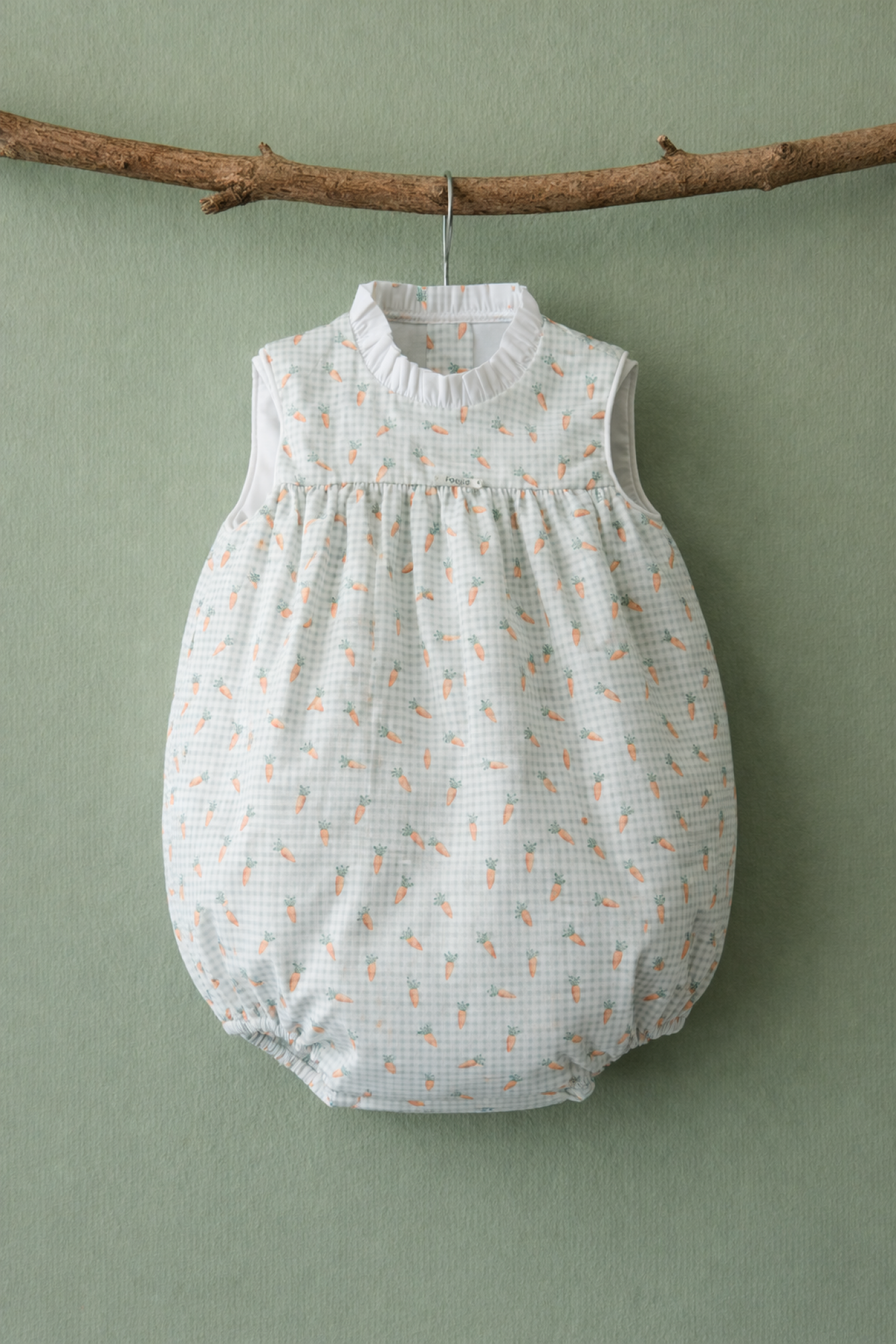 Pelele para bebé niña de Nueva colección P-Verano confeccionado en algodón ligero y transpirable, en tono verde agua suave con delicado estampado mini de zanahorias en colores empolvados.