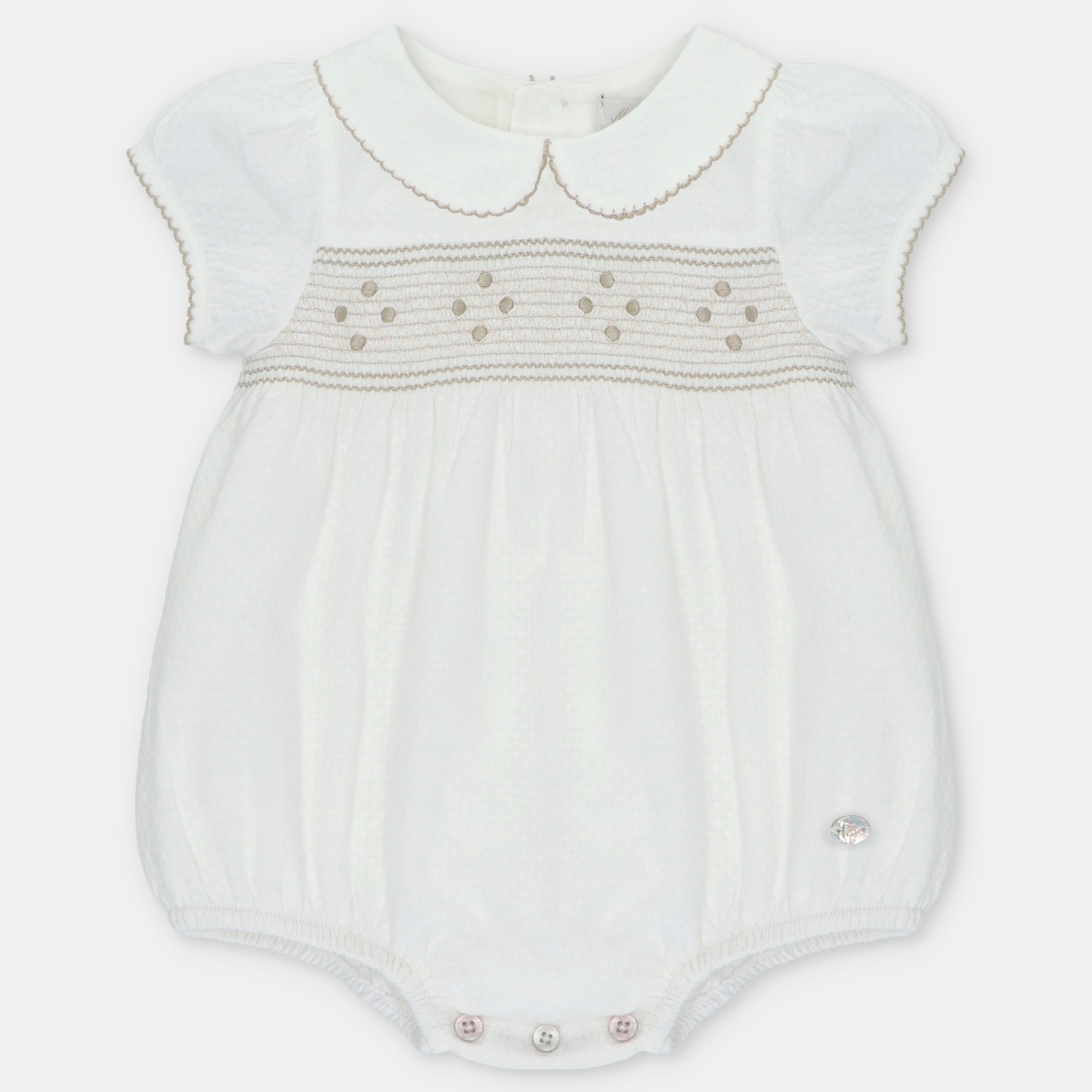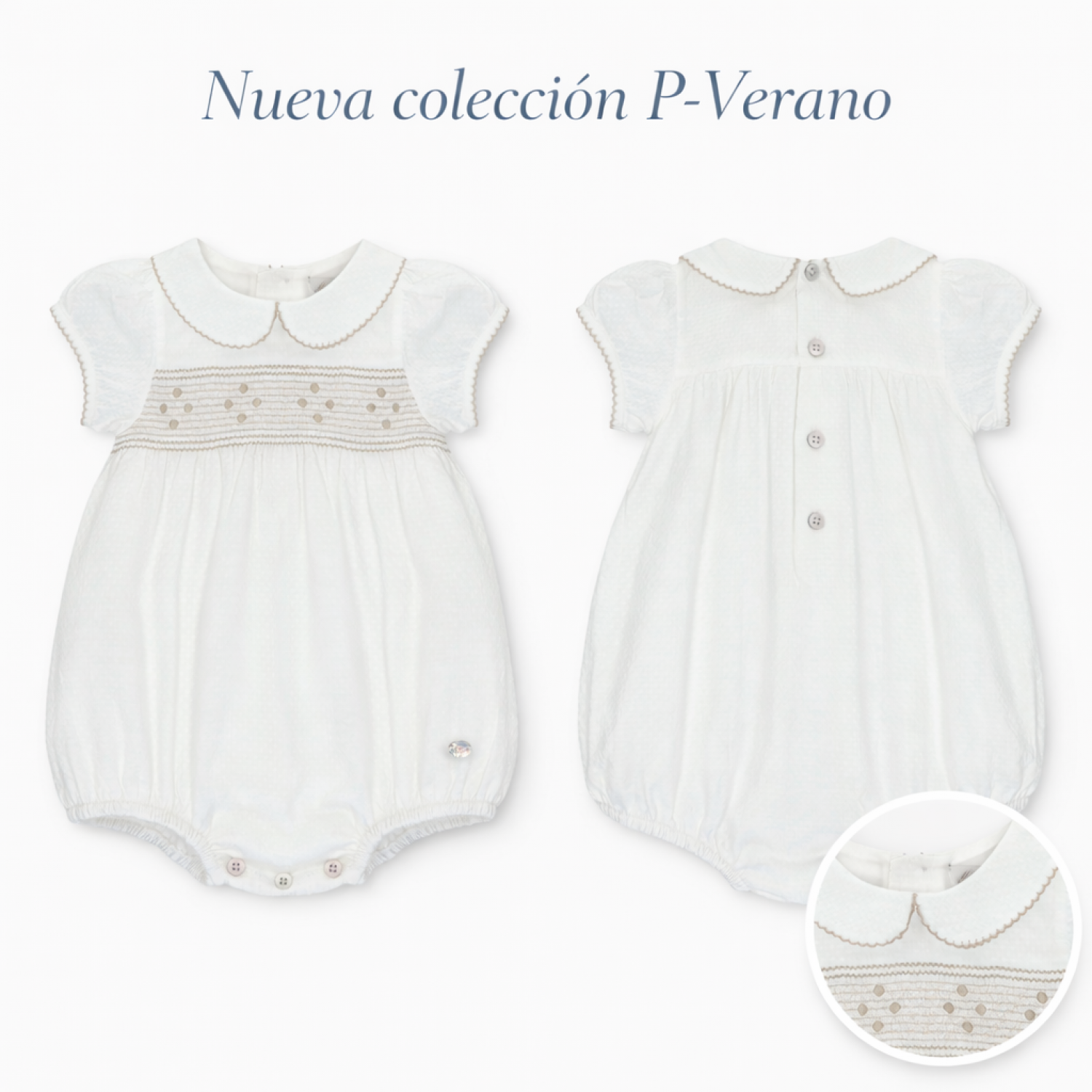 Cuello bebé clásico con pespunte decorativo en tono arena a juego, aportando un acabado refinado y muy cuidado.