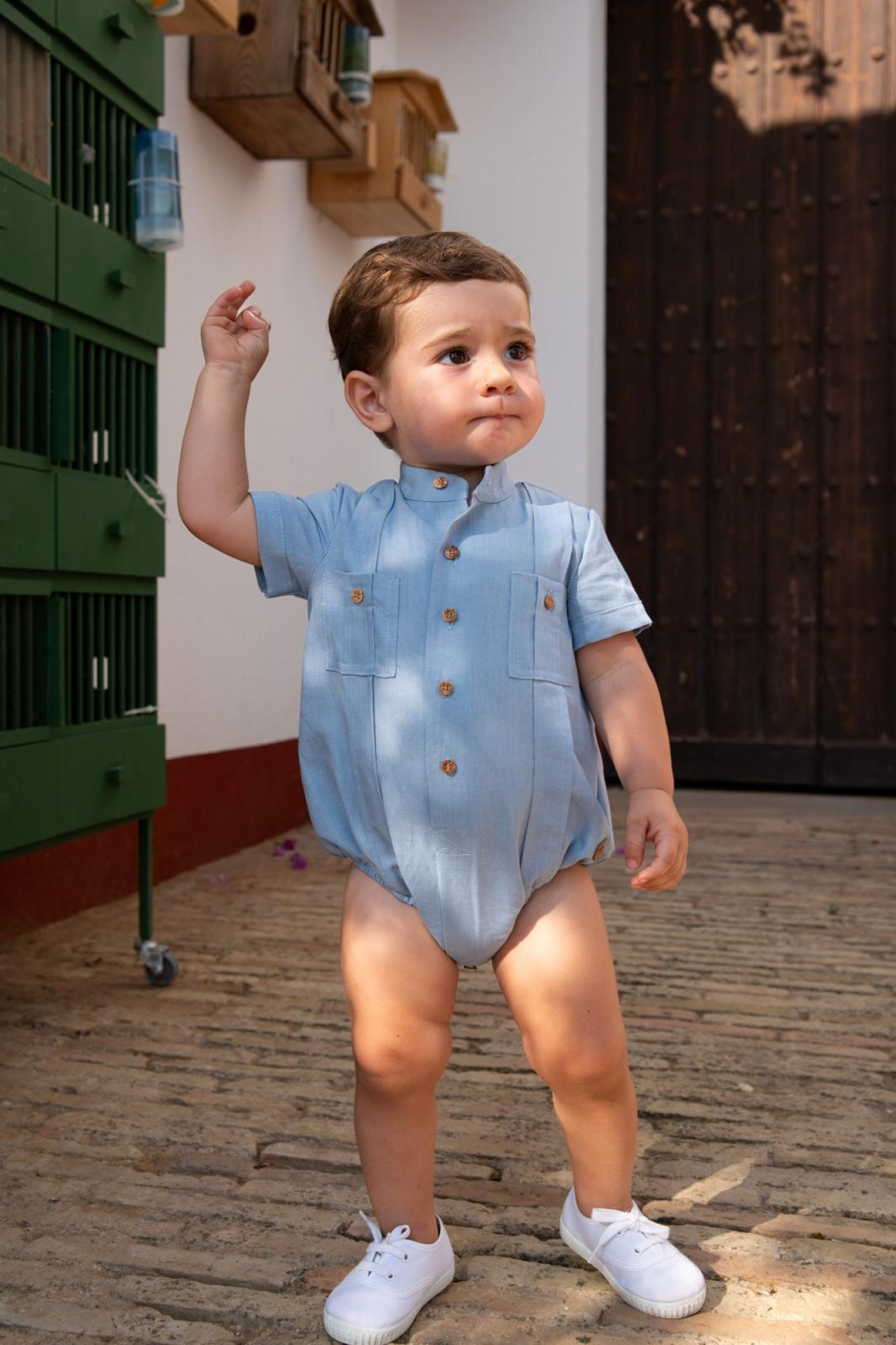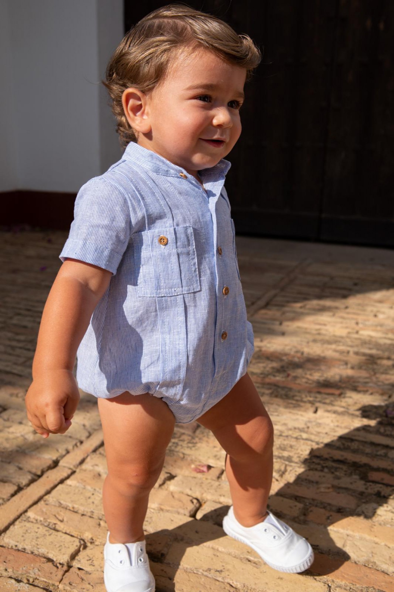 Diseño de manga corta con cuello mao, botonadura delantera en botones de madera y dos bolsillos de plastrón en el pecho que aportan un acabado clásico y muy cuidado. Su silueta es cómoda y ligera, perfecta para los más pequeños.