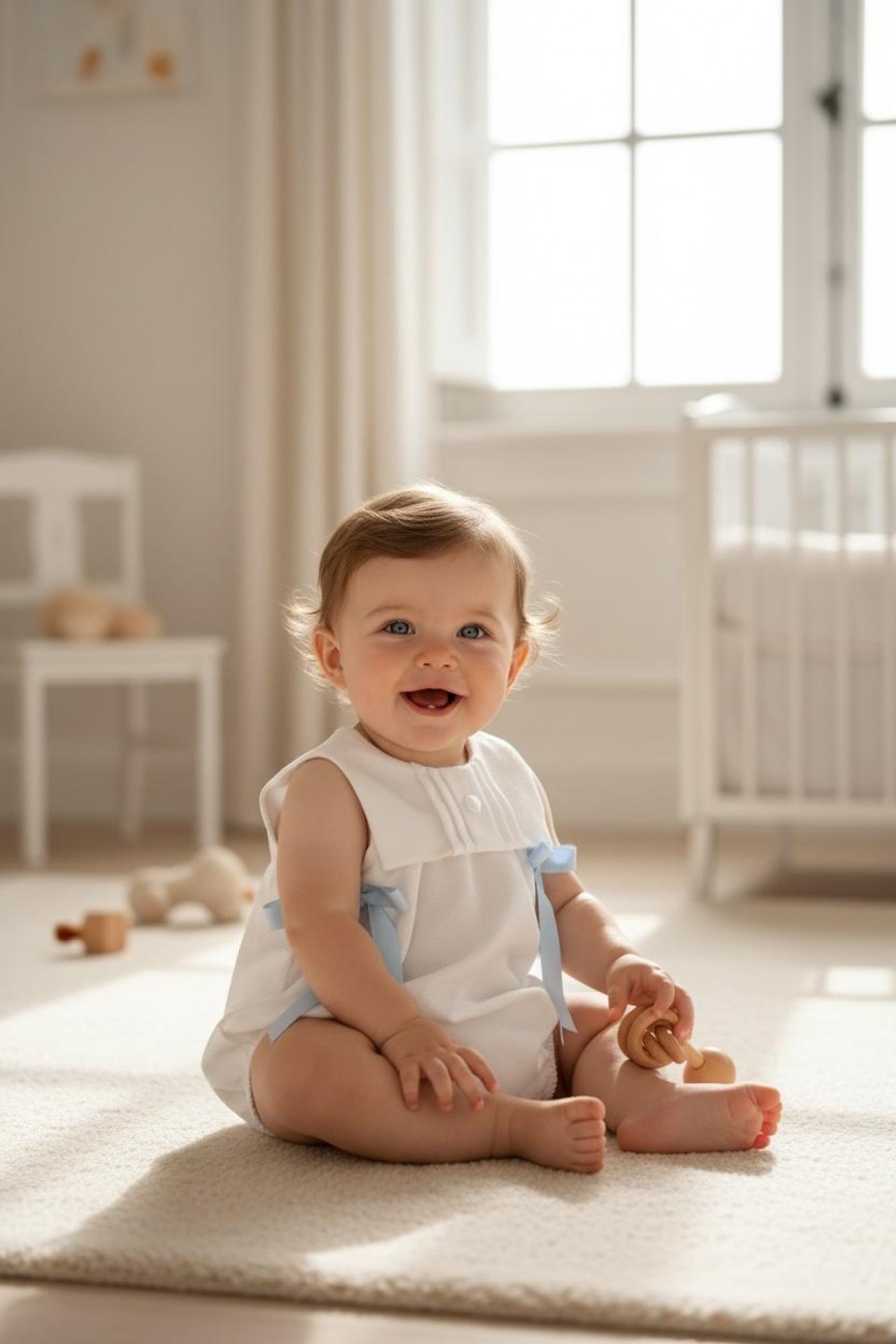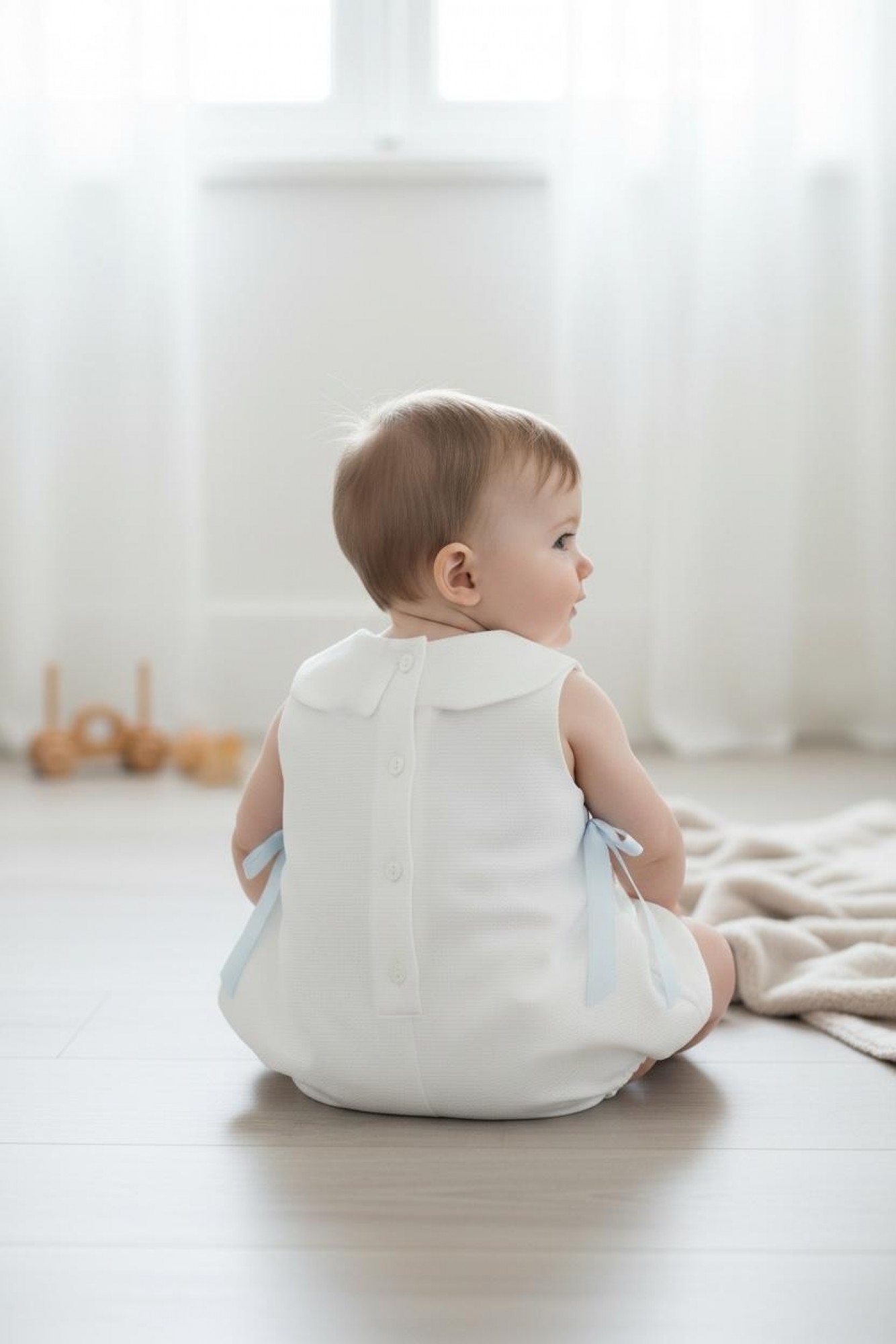 Destaca su bonito babero unido al propio pelele, con pequeños pliegues y botón central que aportan un toque tradicional y muy dulce. A ambos lados incorpora lazos en tono celeste que realzan el conjunto y aportan un contraste suave y elegante.