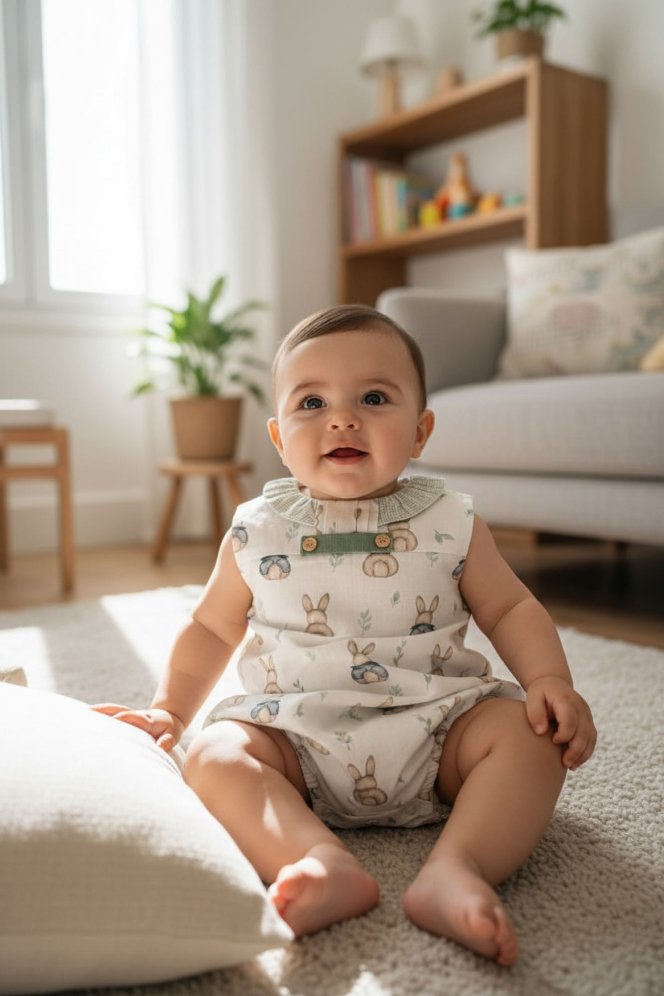 • Confeccionado en tejido de popelín color crudo con estampado conejitos en tonos azul y arena. Lleva cuello vichy verde y una cinta en el pecho color verde hierva con botoncito de madera.