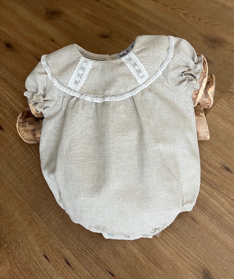 Es lino color arena. Con cuello grande rematado con puntilla en crudo. Manga farol. Sencillo pero fino para cualquier evento.