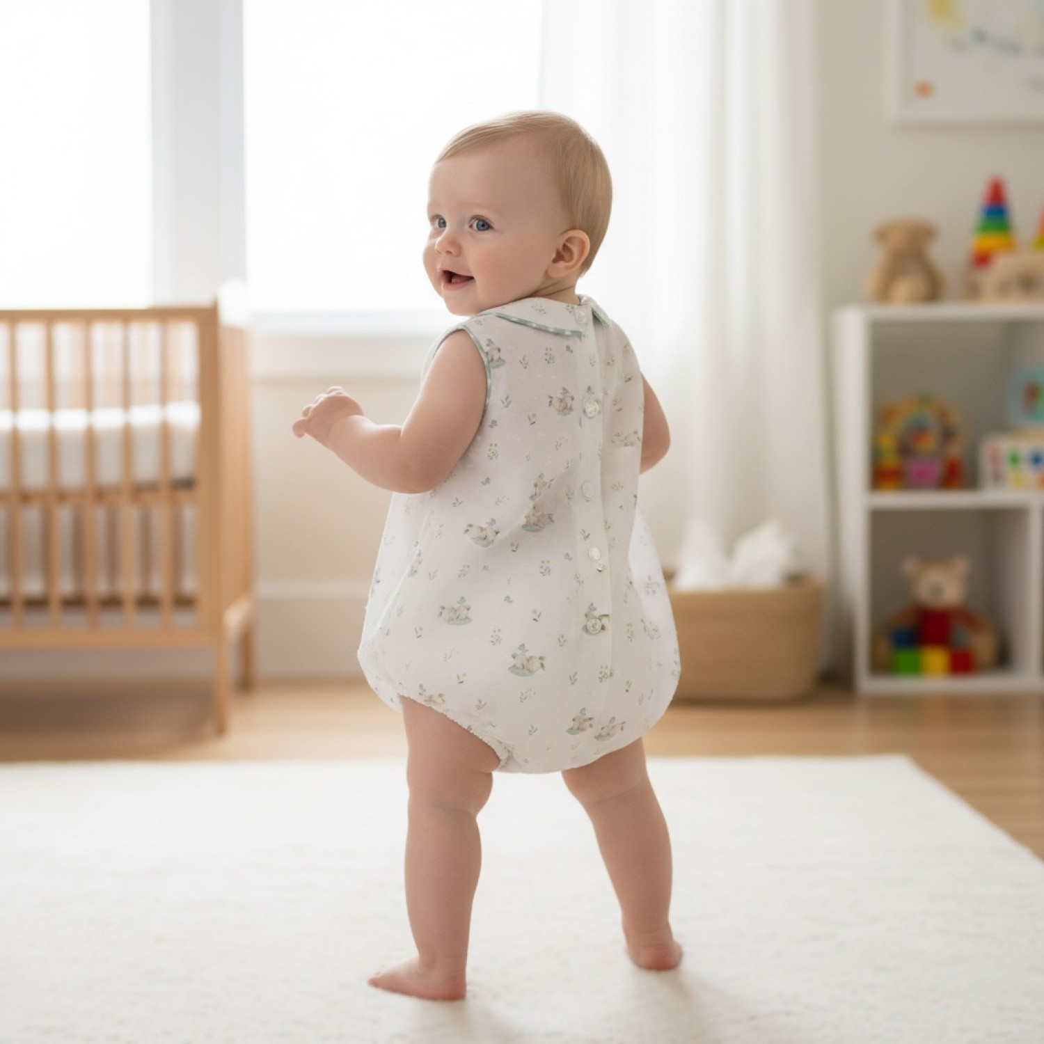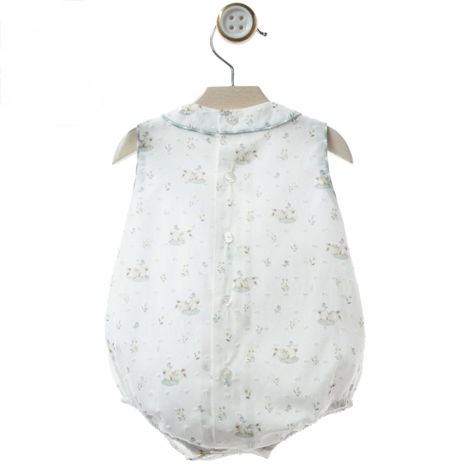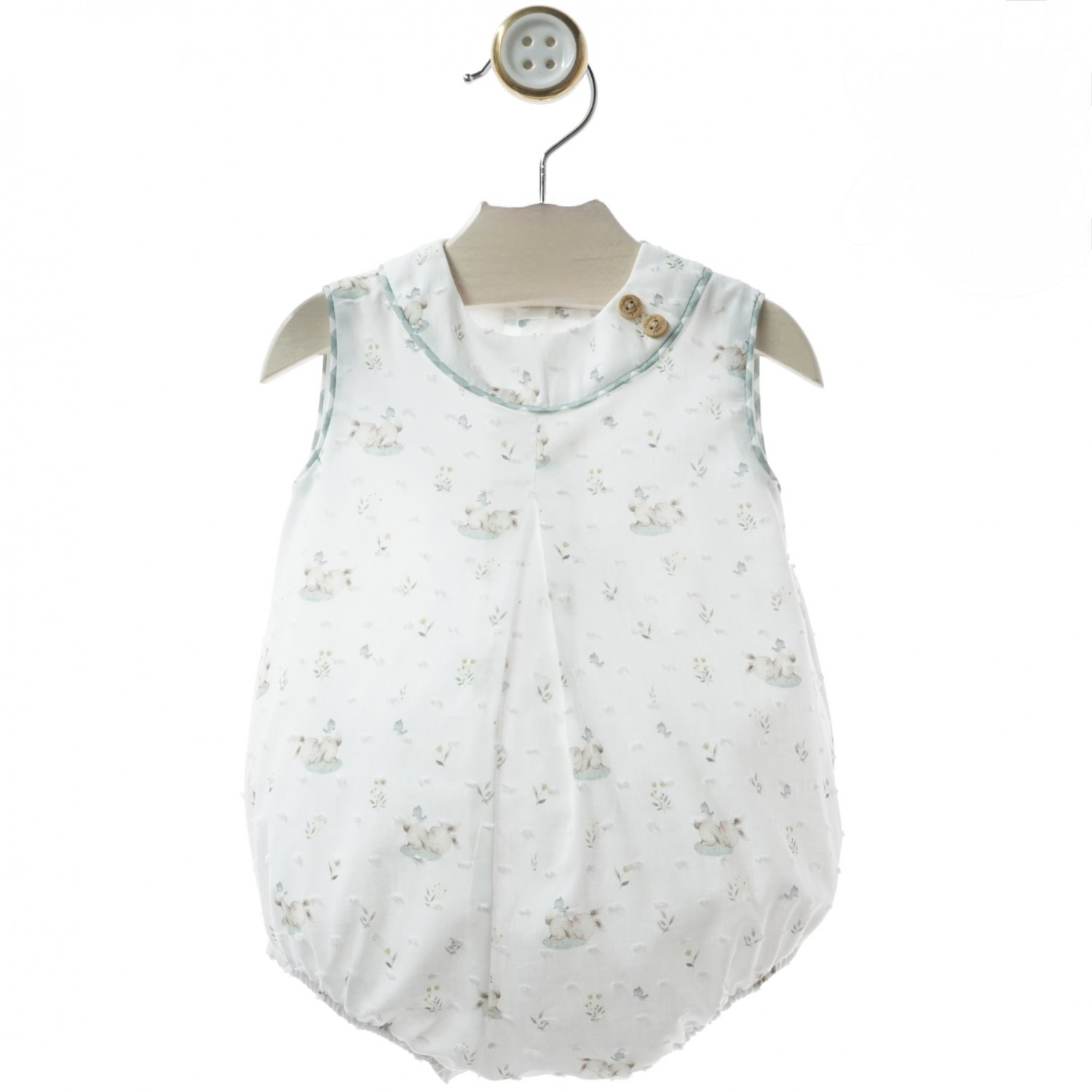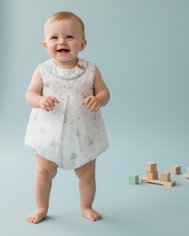 Pelele unisex de la colección Gres, confeccionado en un delicado tejido de plumeti blanco con pequeño estampado infantil en tonos suaves.