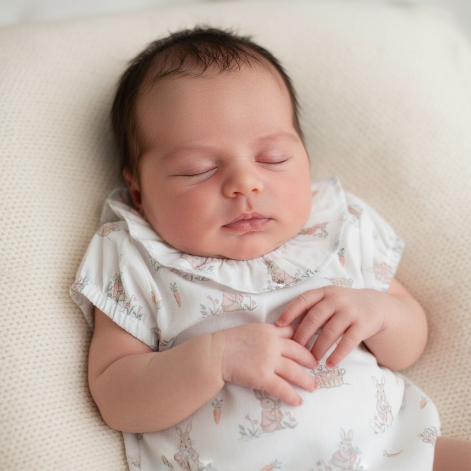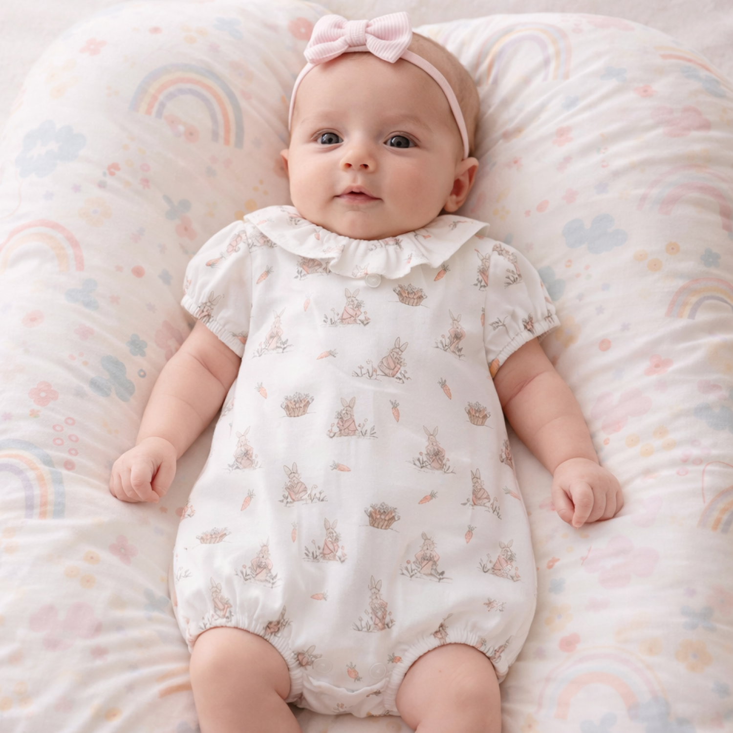 Estampado de conejitos en tonos rosita, con un aire dulce y delicado.