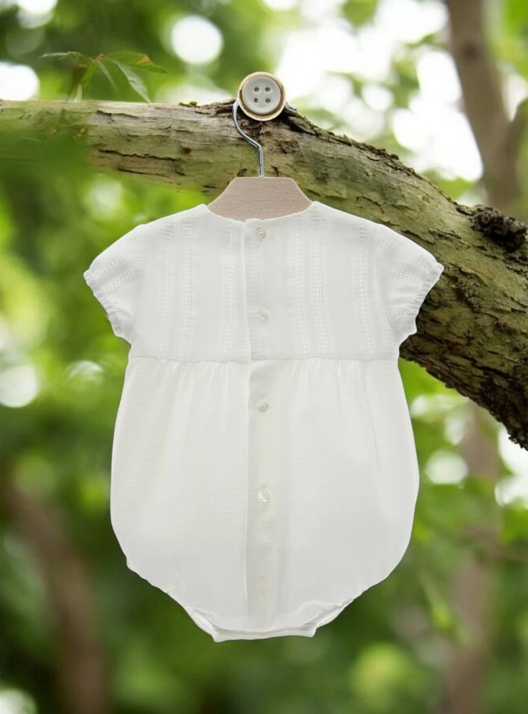 • Confeccionado en un tejido de batista de algodón con vainica, lleva pasacintas bordado en blanco con cinta de raso verde. Es unisex