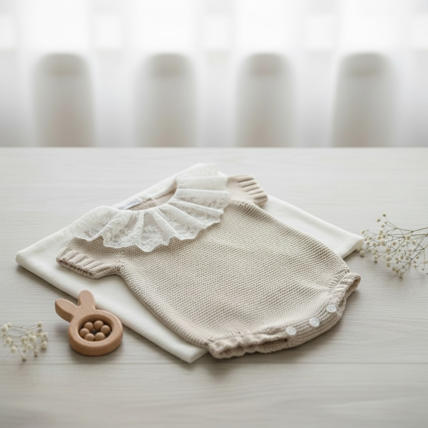 Pelele unisex en punto arena con cuello de Guipur