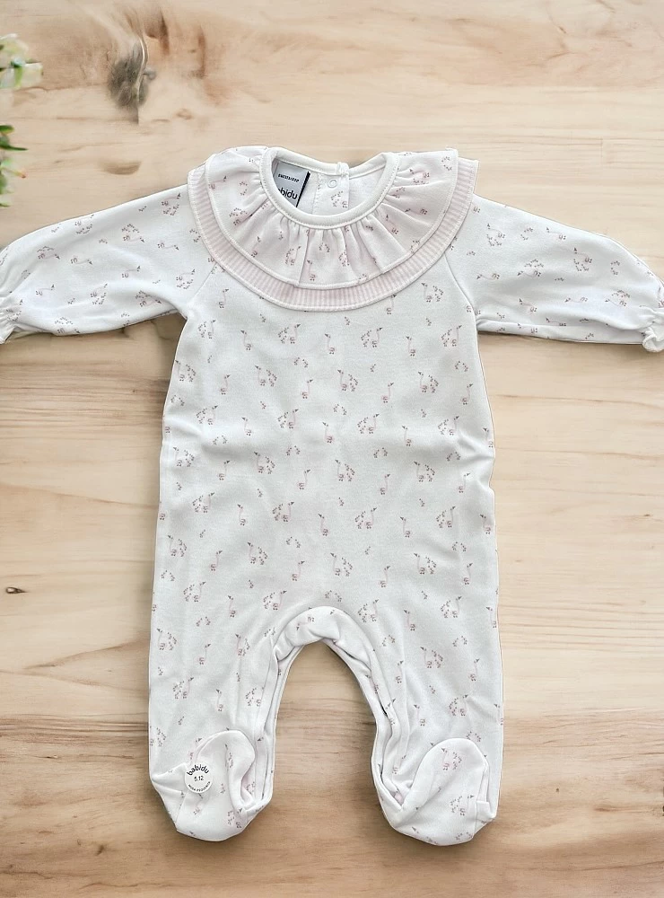 Confeccionado en algodón 100 %. Es blanco con estampado patitos en rosa y cuellos volante de rayas.
