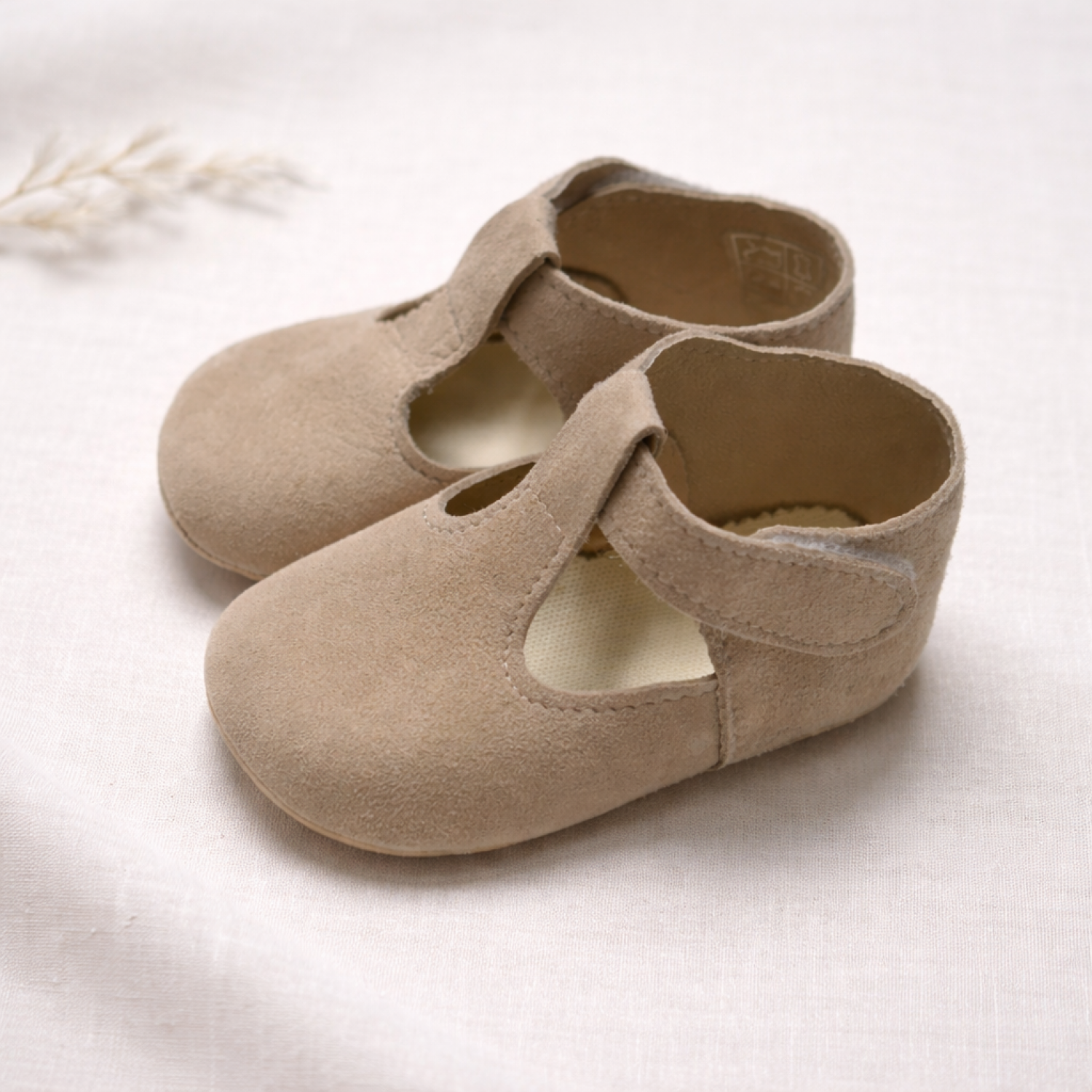 Sandalia para bebé niño en ante color arena, un tono neutro precioso y súper combinable para looks de ceremonia o para vestir.