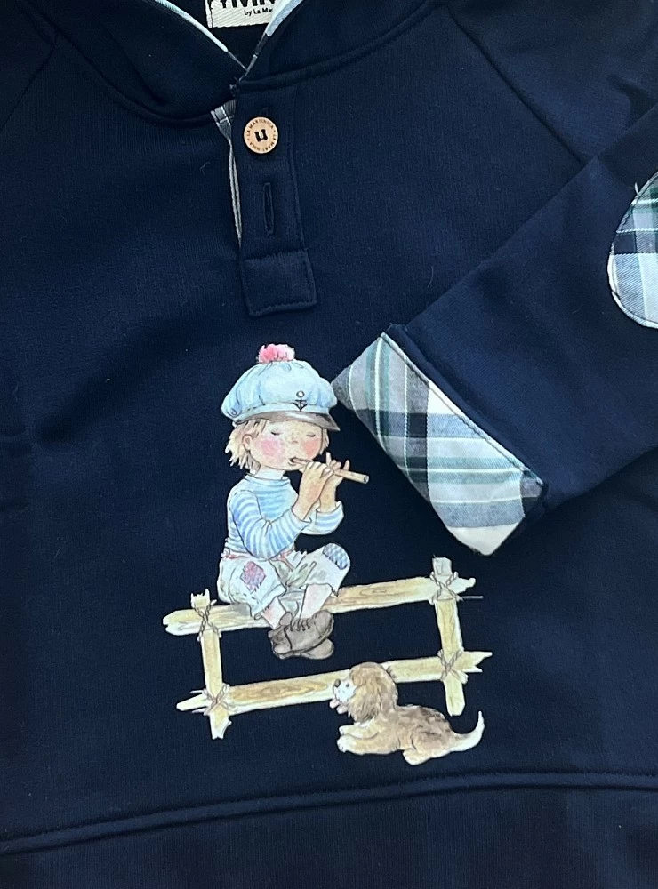 De algodón gordito color marino. Lleva capucha con interior de cuadros y un bonito dibujo de niño.