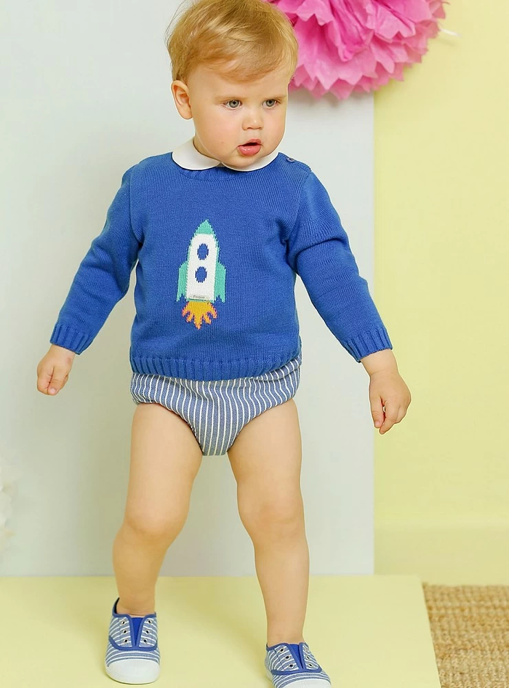 Confeccionado en punto de algodón azul Francia con dibujo cohete. Es a juego con conjuntos de la misma colección. Los puedes ver abajo en productos relacionados.