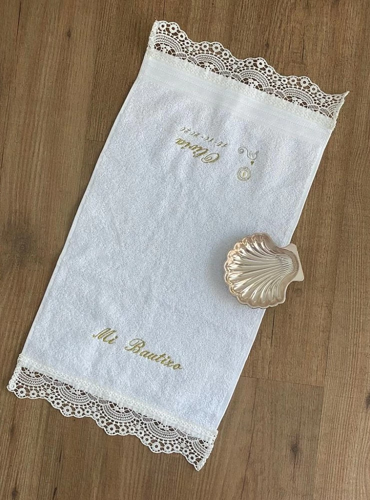 Toalla de bautizo en rizo blanco con puntillas. Personalizada