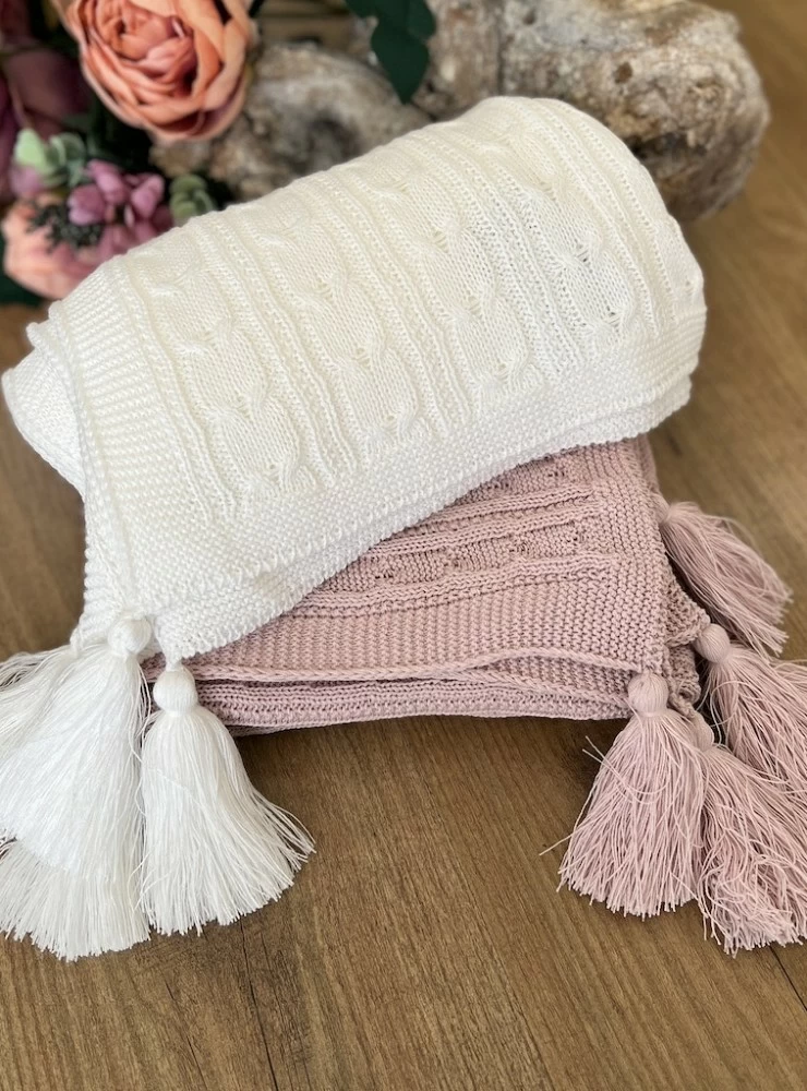 Confeccionada en punto finito muy similar algodon con dibujo de ochos y borlas en el mismo punto.