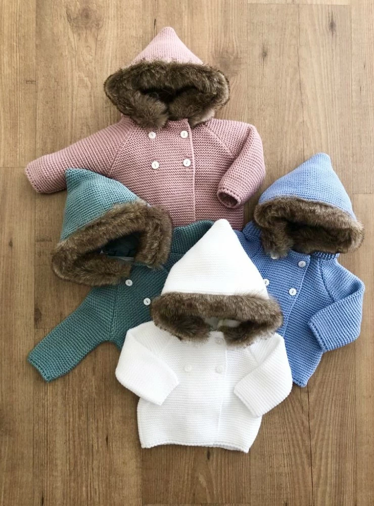 Confeccionado en punto gordito con capucha rematada en pelo color camel.