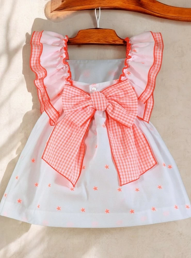 Es de popelín blanco con estrellas bordadas en naranja y doble volante en la manga con cuadrito vichy. Lazo trasero muy bonito