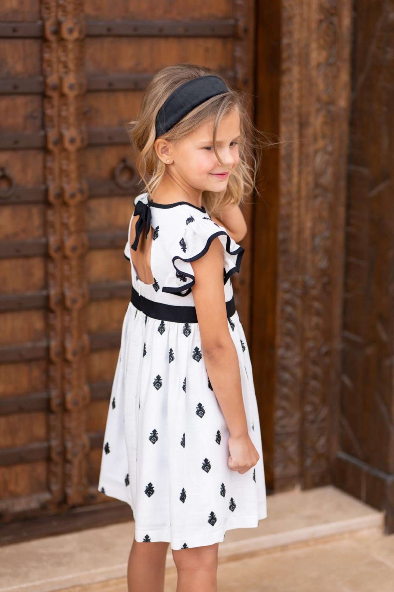 Confeccionado en color blanco roto con delicado estampado de pequeños motivos en negro distribuidos por toda la prenda, creando un contraste elegante y atemporal. Destaca su manga corta con volante rematado en negro y cintura marcada con banda en el mismo tono.