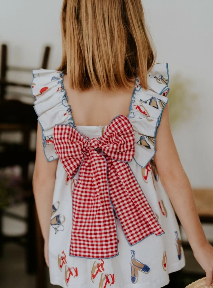 Confeccionado en popelín con fondo crudo y estampado alpargatas. Lleva una bonito lazo de cuadro vichy rojo y blanco.
