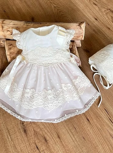 Confeccionado en tejido organza satinada con jaretas y pasacintas de bolillos con cintas de raso. Renates en puntilla guipur. Mangas forradas al igual que el resto de vestido.