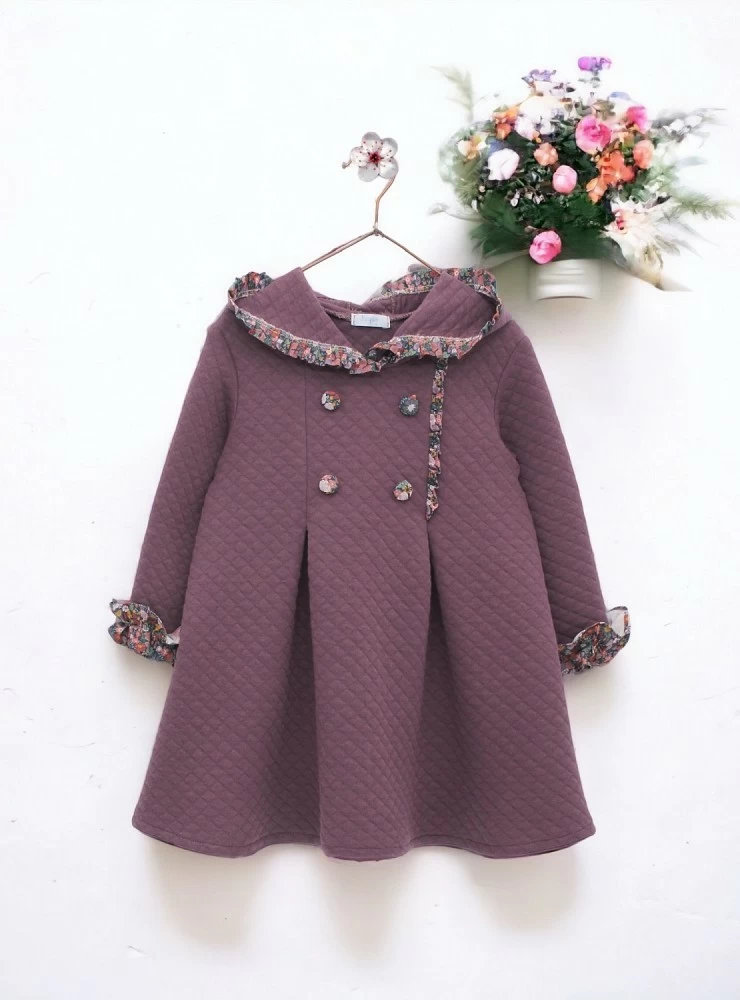 Vestido confeccionado en tejido de algodón acolchado color morado con remates en flores y capucha