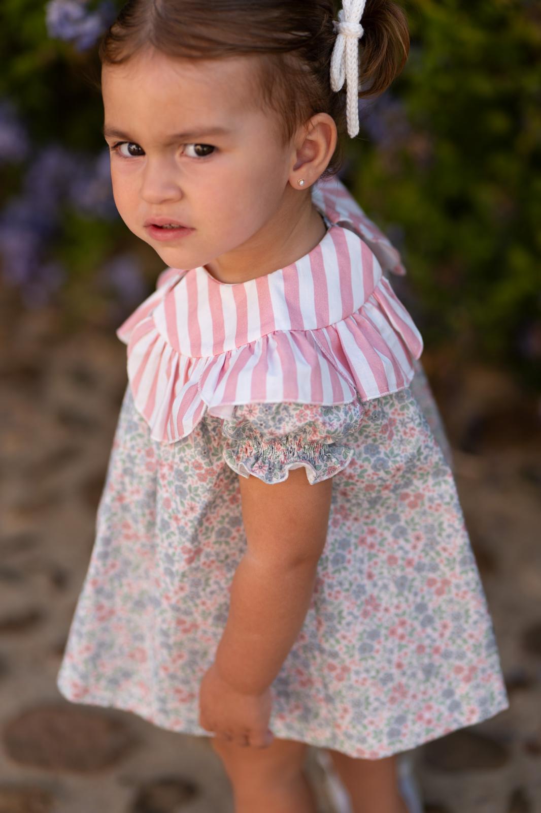 Destaca por su gran cuello volante en rayas verticales rosa y blanco, que aporta mucho protagonismo al diseño. Manga corta con volante fruncido en el mismo tejido floral y corte recto con caída ligera y cómoda.