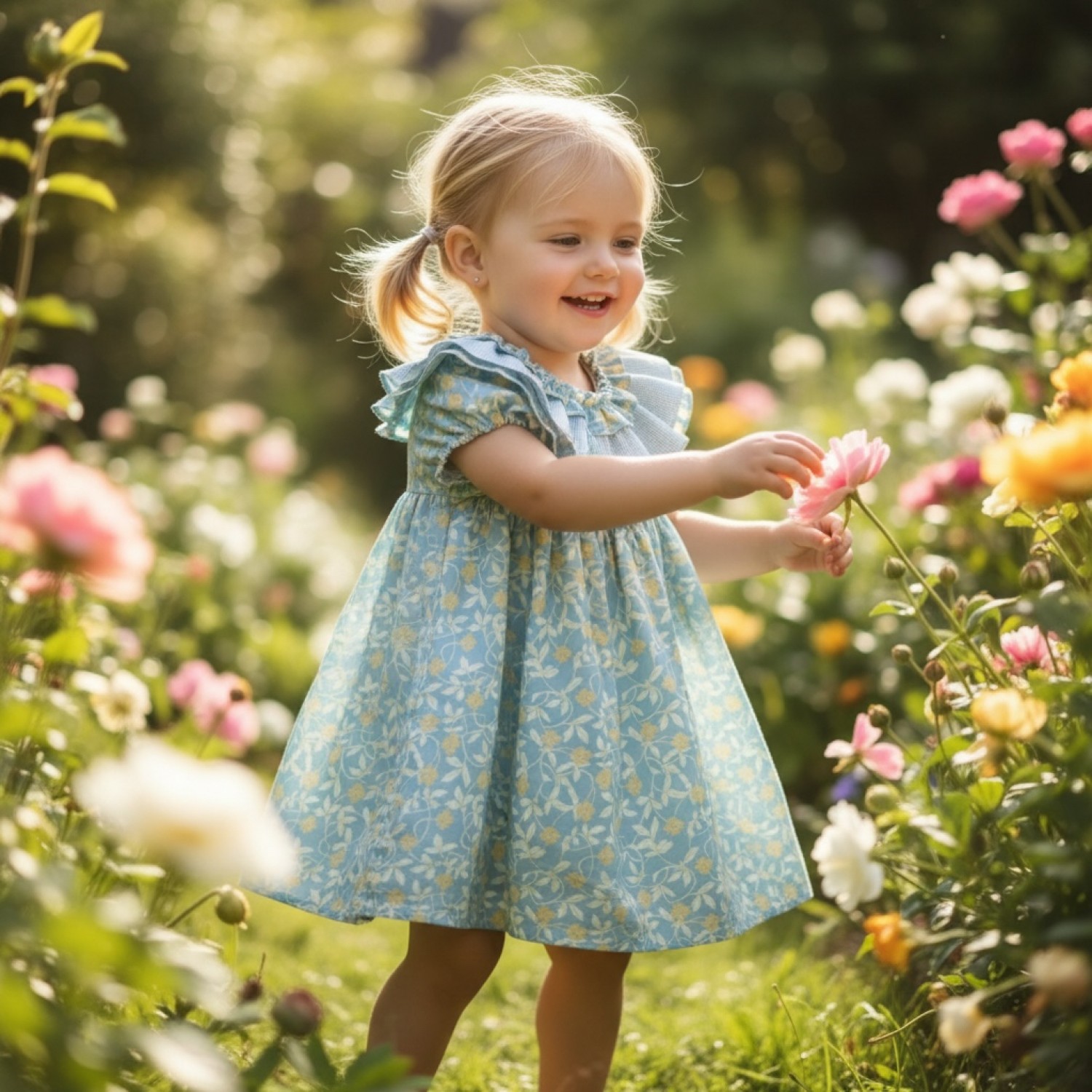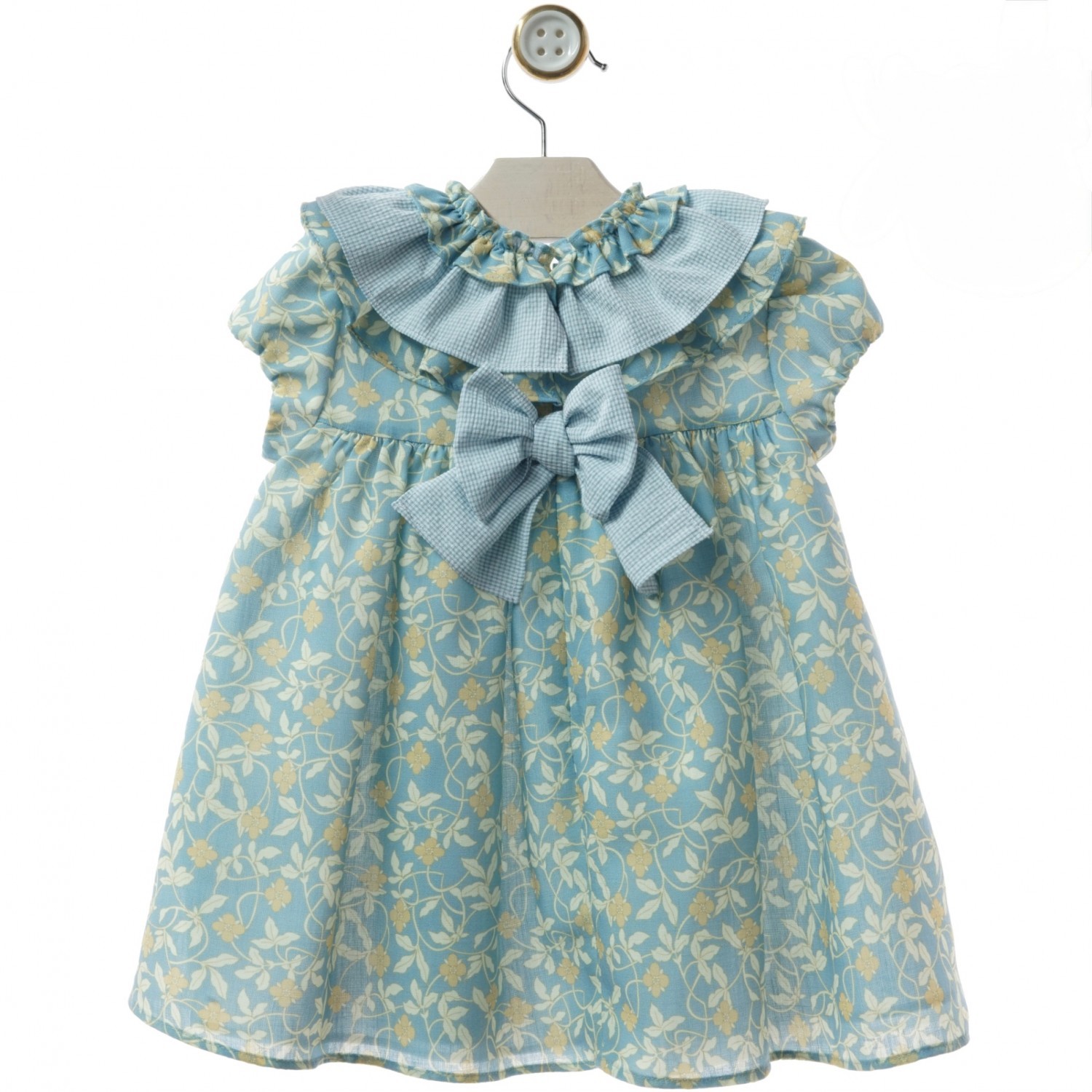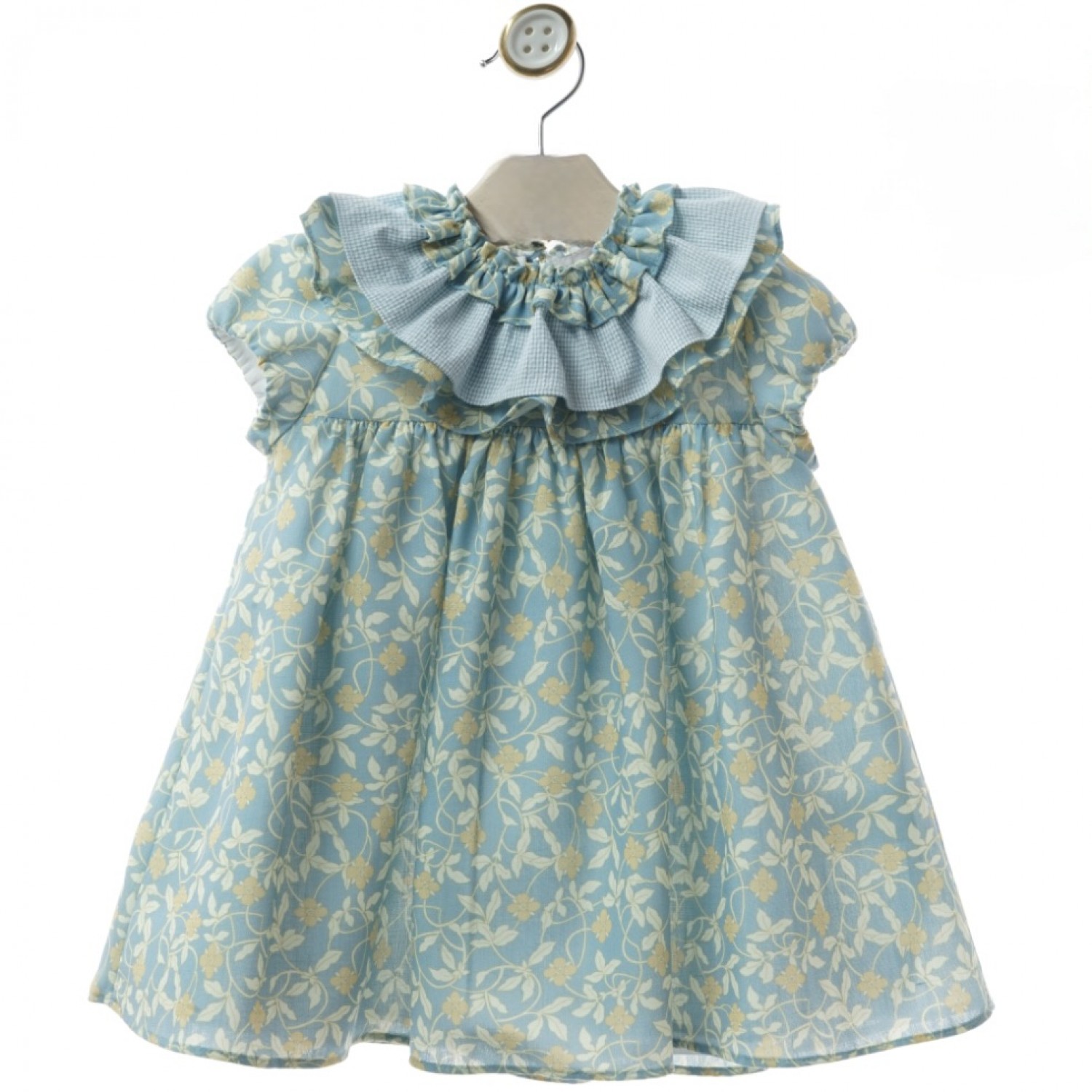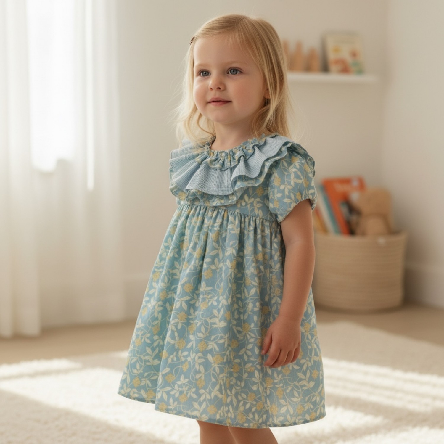 Vestido de la colección Alfarería confeccionado en un delicado tejido de fondo azul empolvado con estampado floral en tonos suaves, ideal para los días de primavera y verano. El diseño presenta un corte amplio y vaporoso que aporta movimiento y frescura, con manga corta ligeramente fruncida para un acabado dulce y cómodo.