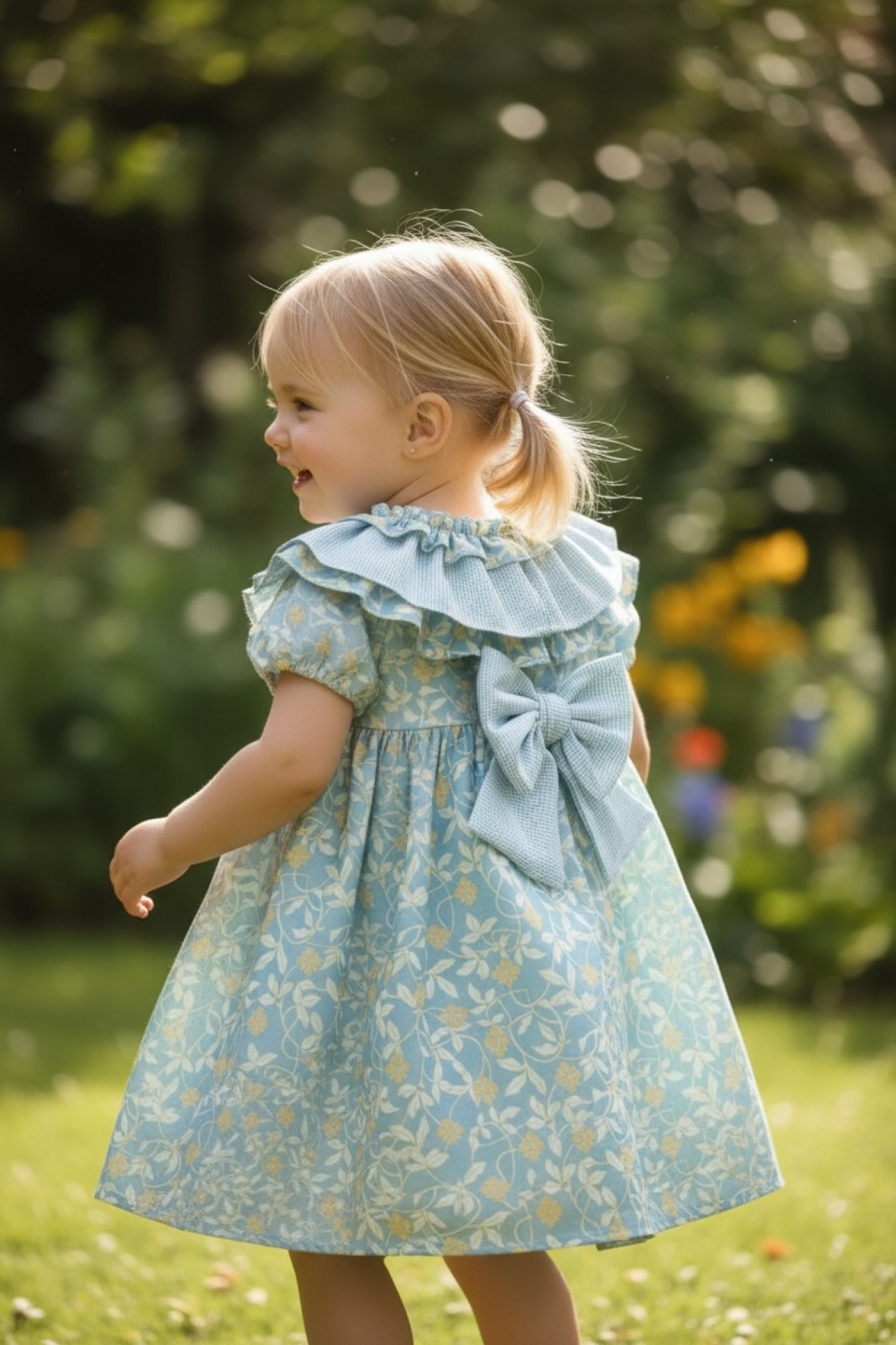 La parte delantera destaca por su amplio cuello volante combinado en tejido a contraste, que enmarca el escote con un aire artesanal y elegante. En la espalda incorpora un gran lazo decorativo del mismo tejido del cuello, aportando protagonismo y un acabado muy especial, además de cierre trasero para facilitar el cambio.