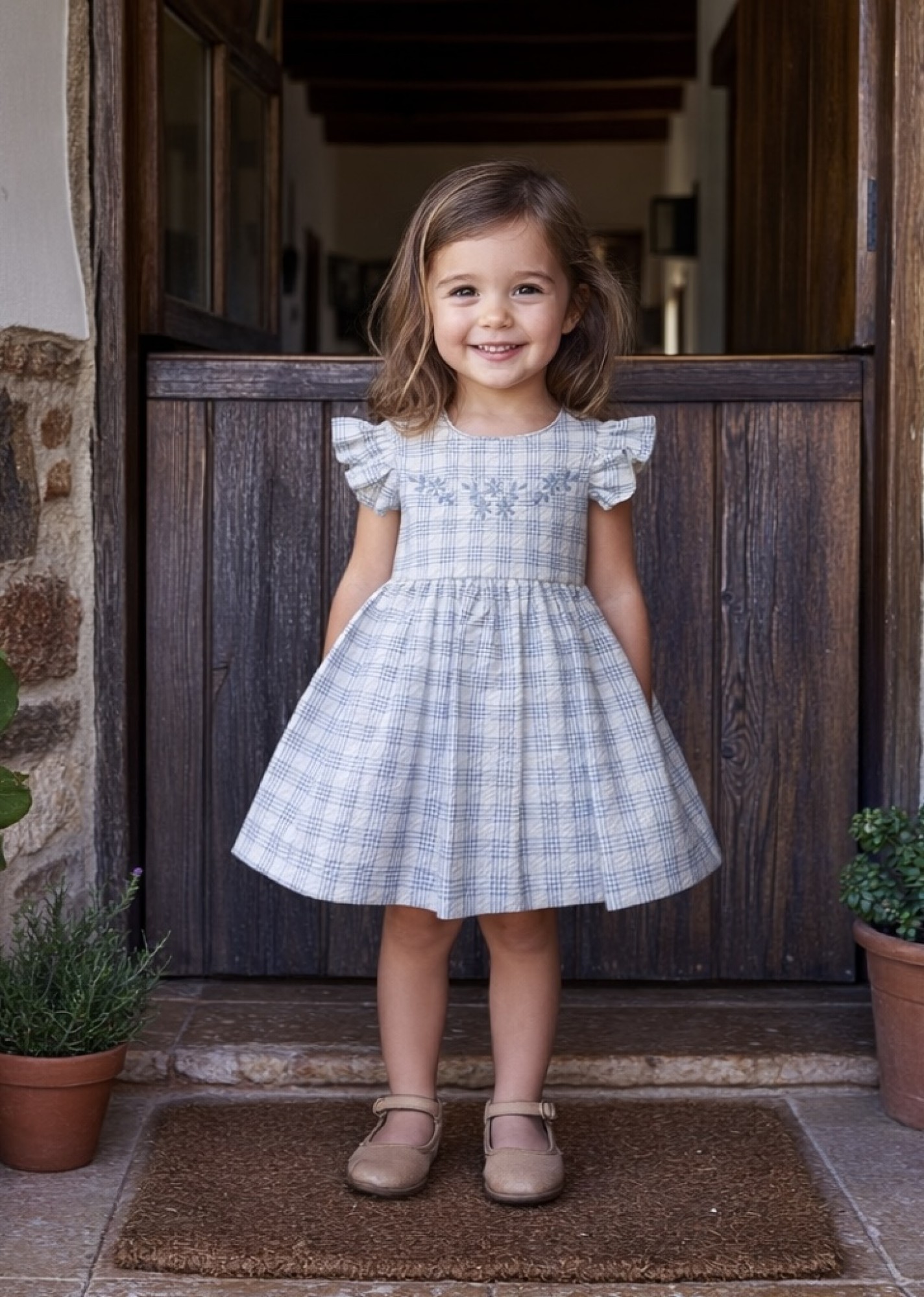 Vestido de niña confeccionado en tejido de algodón 100 % con delicado estampado de cuadros en tonos suaves, ideal para la temporada primavera-verano.