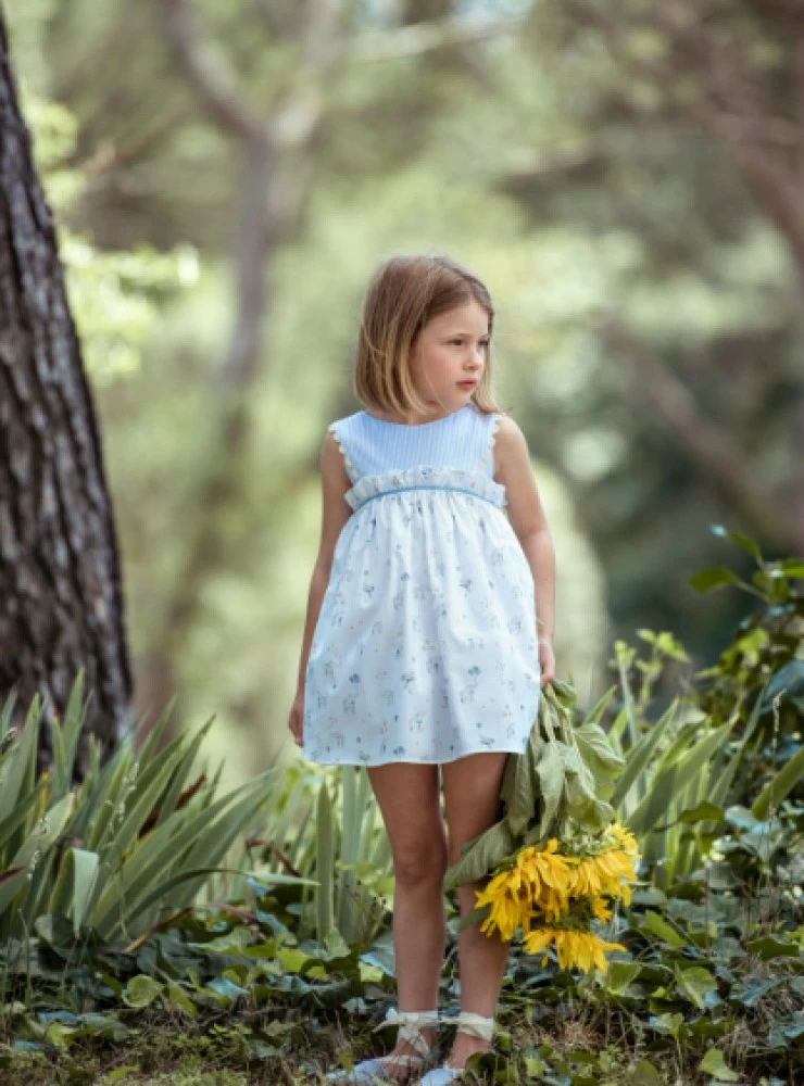 Confeccionado en batista blanca con estampado elefantes y cuerpo en rayas azul. Lleva una espalda maravillosa con lazo. Varias capas de forro para darle vuelo.