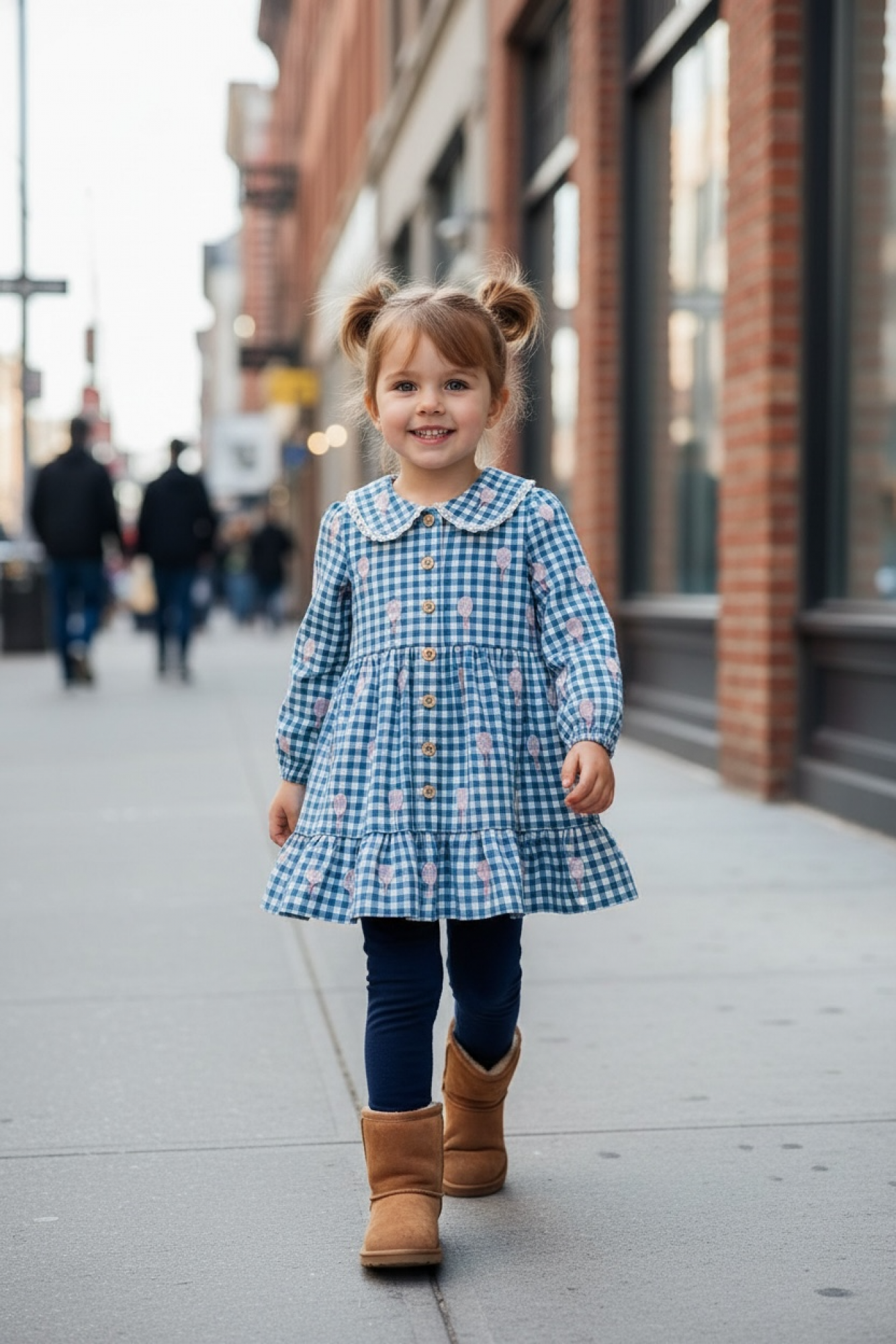 Encantador vestido de la firma Montpetit Bonbon, con estampado de cuadros en azul y detalles con globos aerostáticos , perfecto para dar un aire alegre y diferente. Su diseño incluye cuello bebé con puntilla blanca, botonadura delantera y con volante que aporta movimiento.