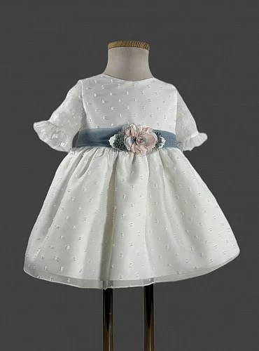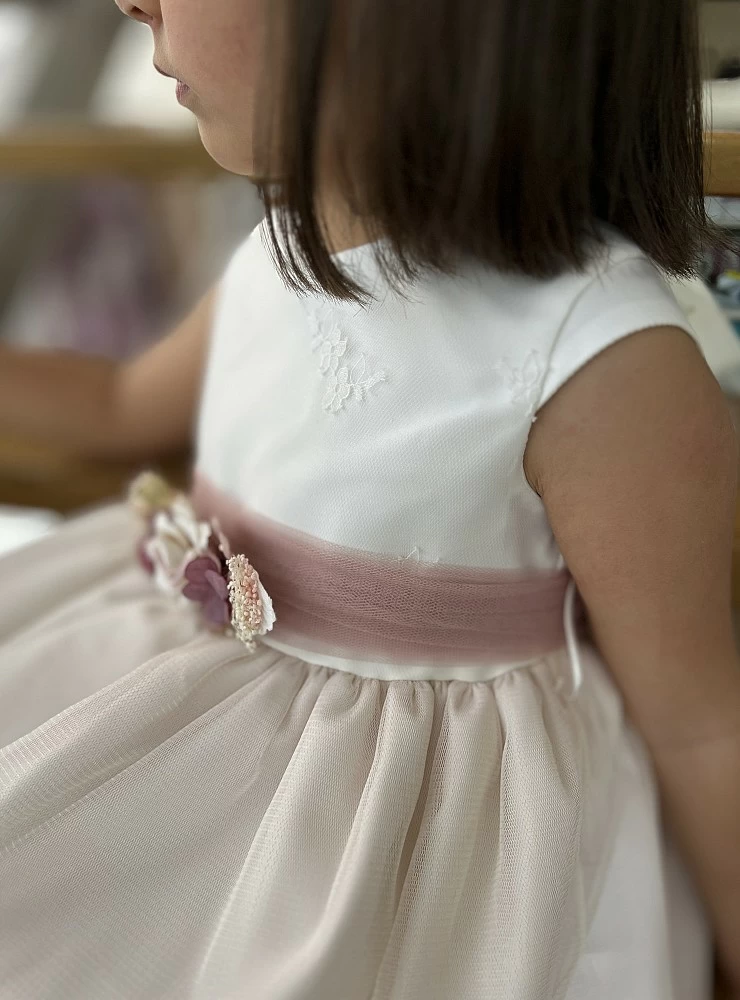 Parte exterior de tul en rosa o verde empolvado, falda en tul liso y cuerpo en tul bordado. Lleva puntilla en el bajo y lazo en tul también con broche desmontable de flores secas al tono del cinturón. Lleva varias capas interiores para darle volumen, la de tul, otra de raso y otra de lino.