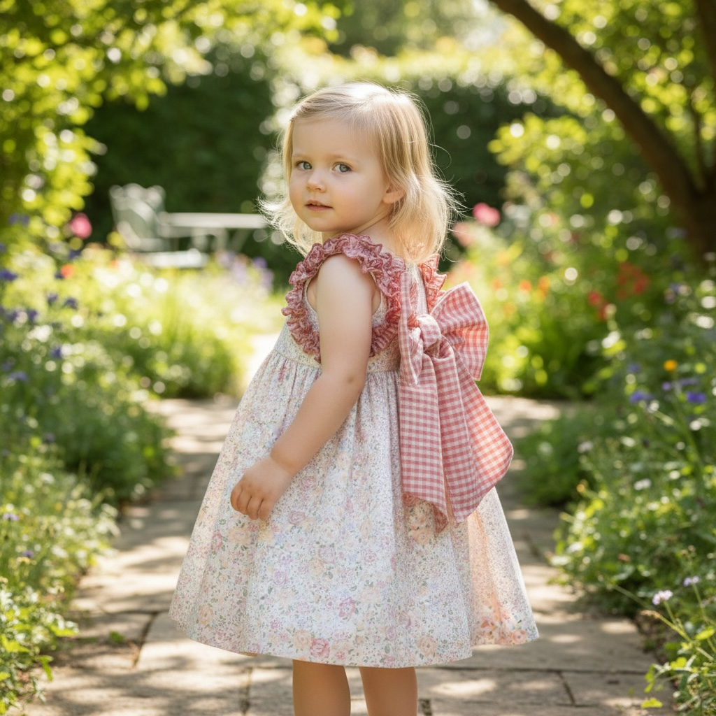 Vestido para niña confeccionado en tejido ligero con delicado estampado floral en tonos suaves, característico de la colección Mayólica.
