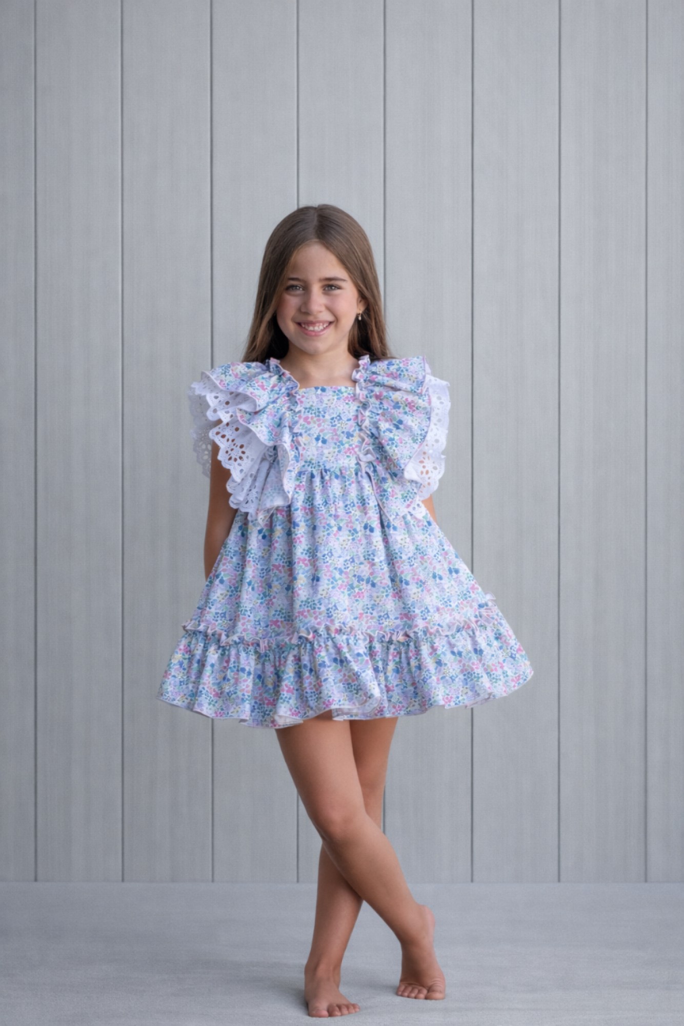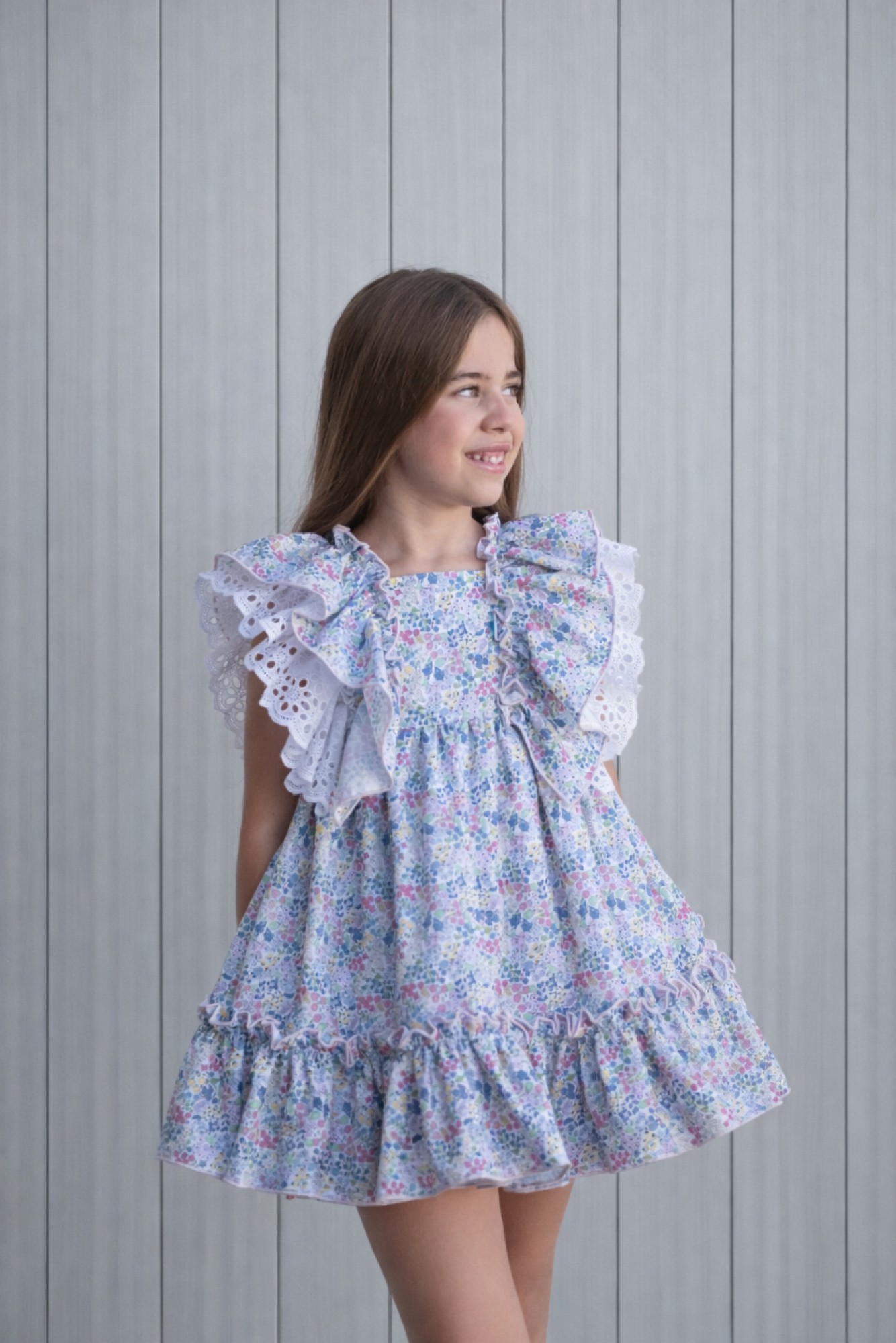 Vestido para niña confeccionado en tejido de algodón con estampado floral multicolor sobre fondo blanco roto.