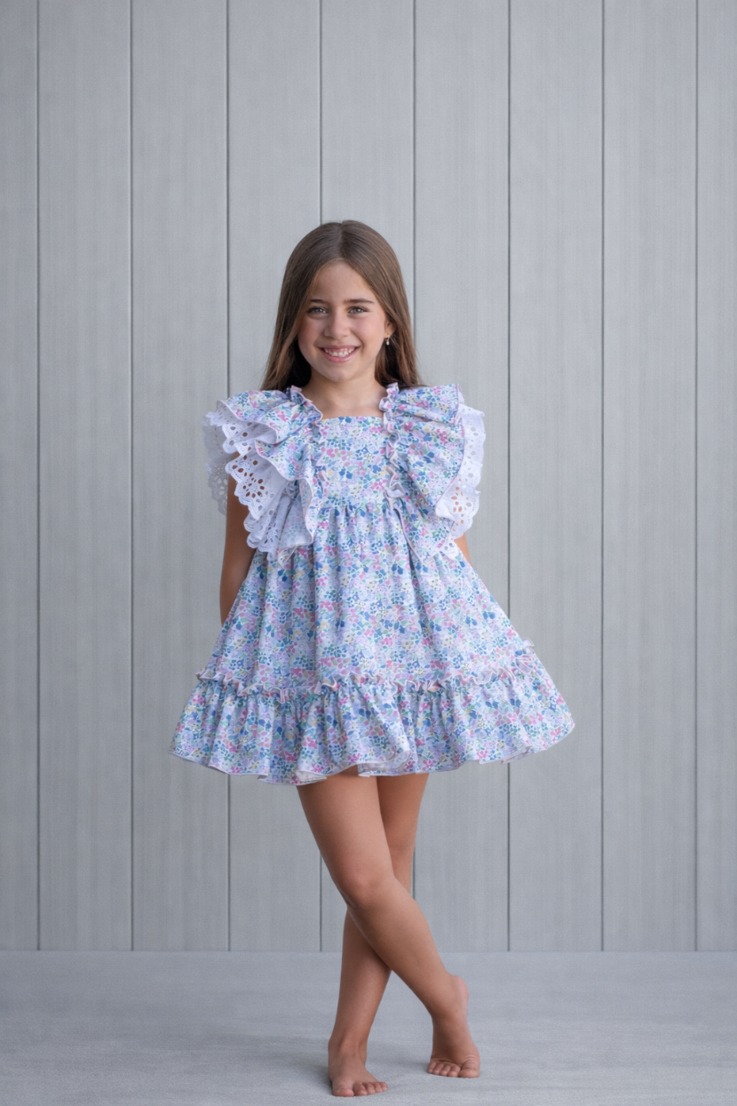 Destacan sus amplios volantes estructurados en los hombros, combinados con volante interior en tejido blanco con bordado perforado tipo puntilla, que aporta contraste y un acabado muy especial.