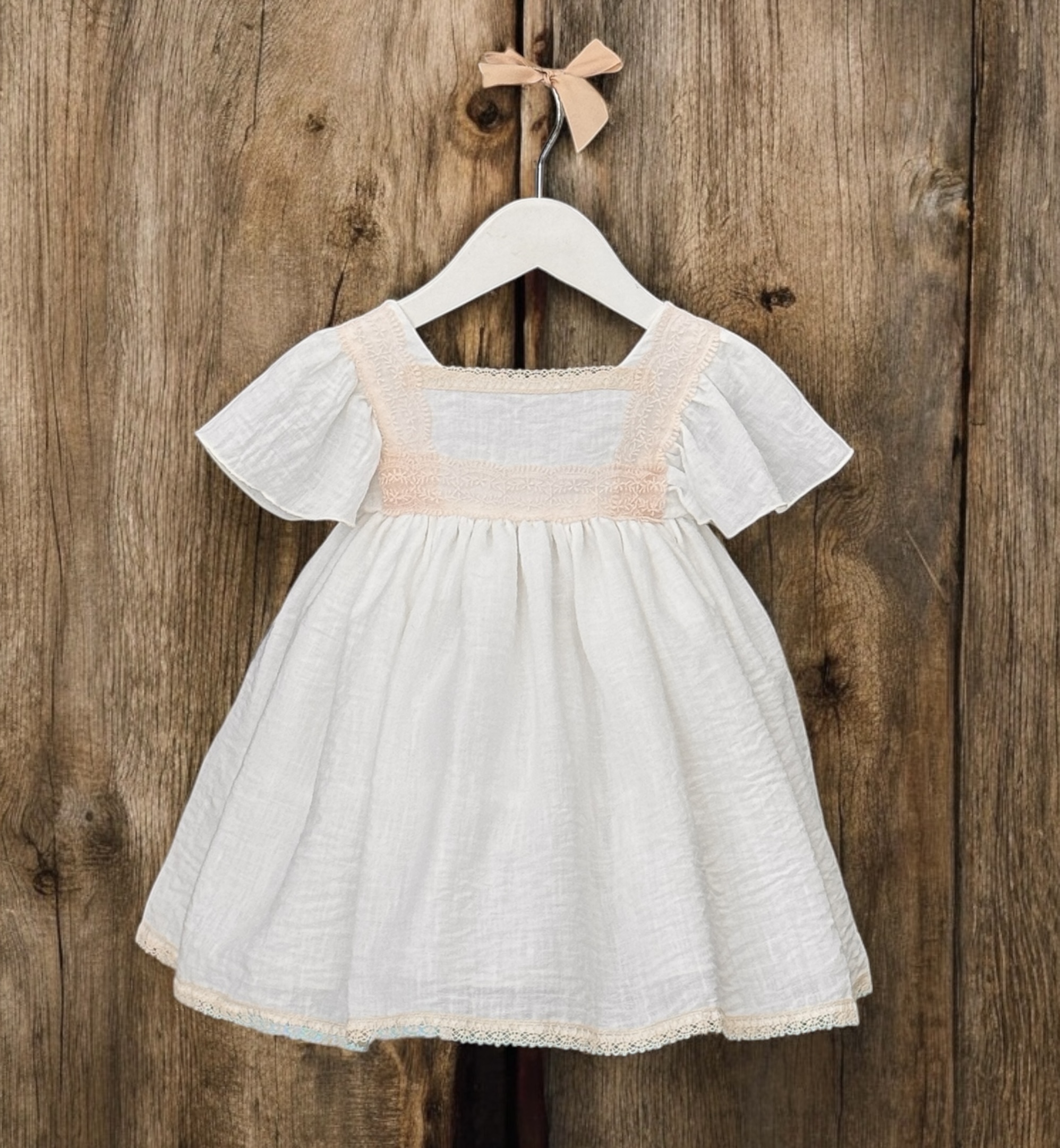 Confeccionado en Bambula de lino color beige. Lleva talla alto, con puntilla de tul bordado en color beige un poco mas subido el tono, manga volante y lazo en espalda con el mismo tejido. Lleva varias capas de forro para darle volumen. Perfecto para cualquier evento.