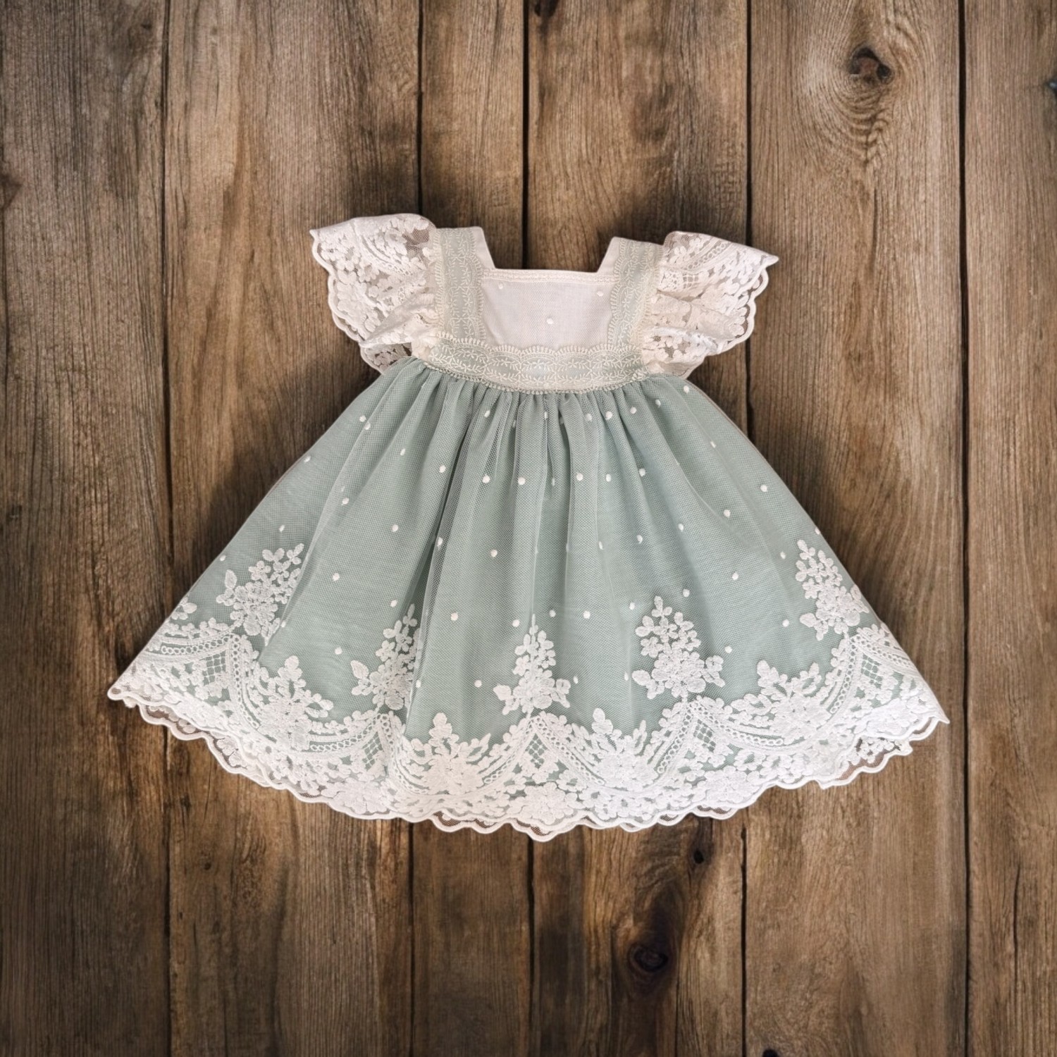Es de talle alto con manga mariposa. Confeccionado en tul bordado color beige con forro interior de bambula verde empolvado. Lleva lazo trasero de bambula y varias capas de forro para darle volumen, puntillas de tul bordado en beige. Es una preciosidad,