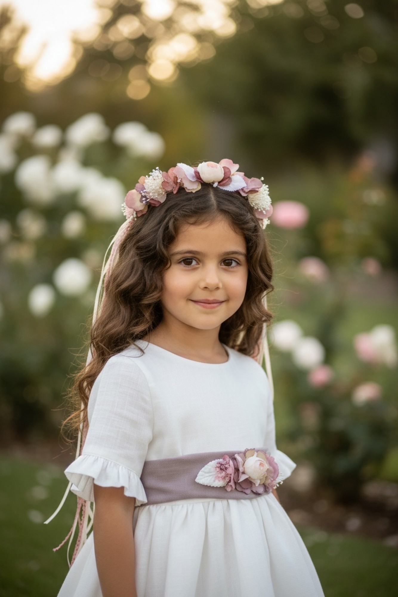 El lazo de lino en tono malva ( las flores del lazo se pueden quitar o poner fácilmente) le da personalidad sin recargar, dejando un acabado fino y muy cuidado.