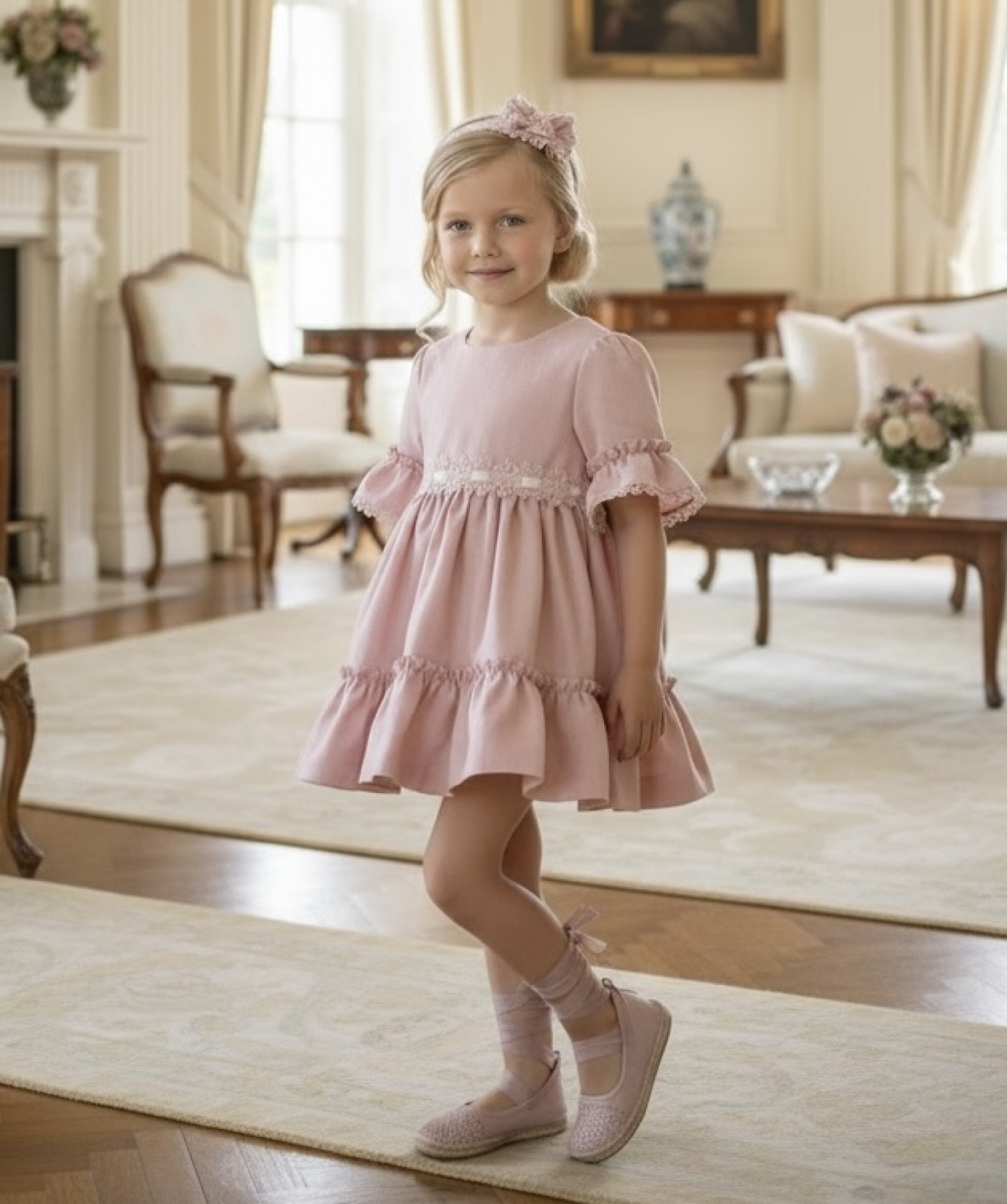 Vestido de niña en tono rosa empolvado, delicado y muy especial para ocasiones bonitas