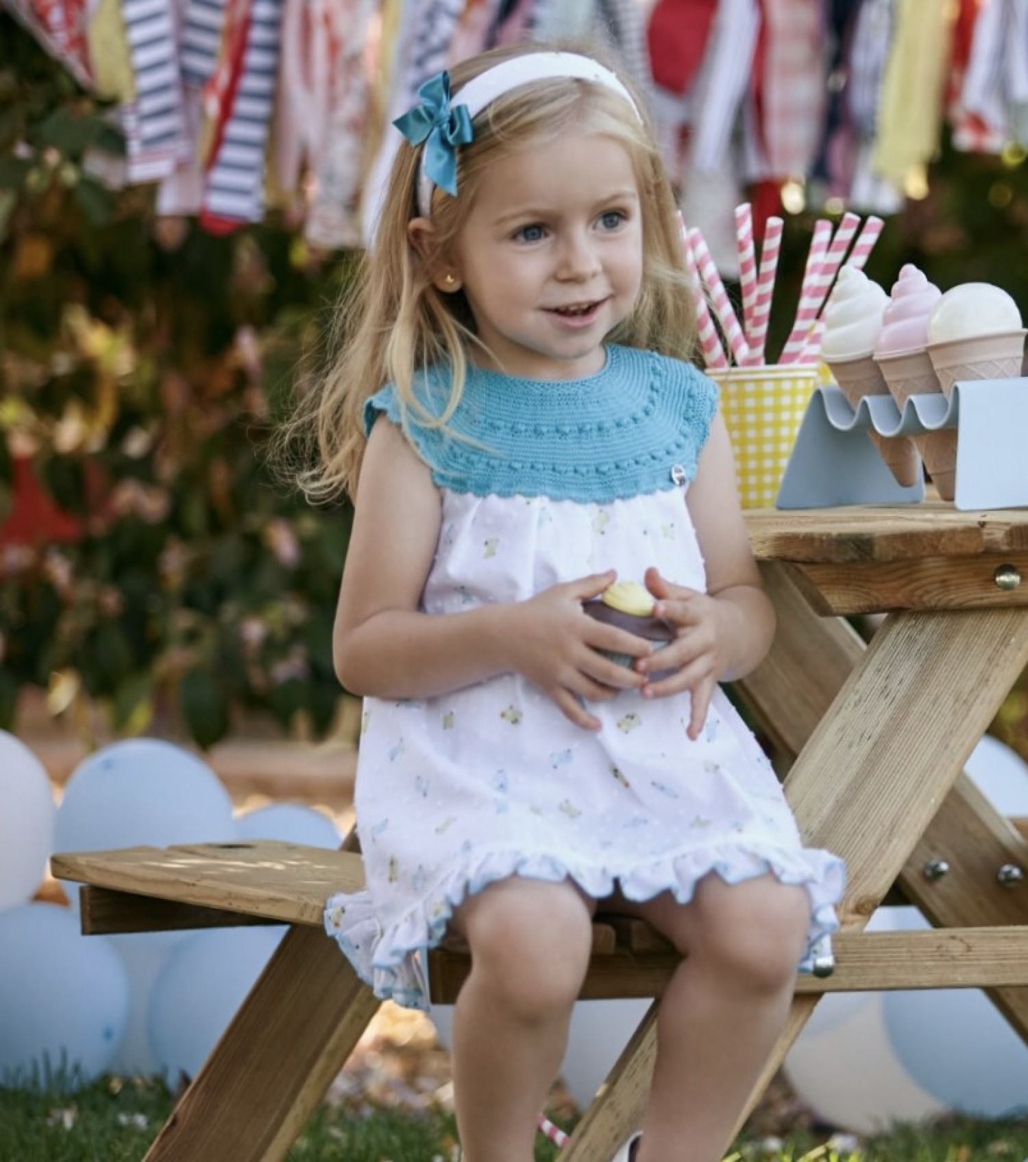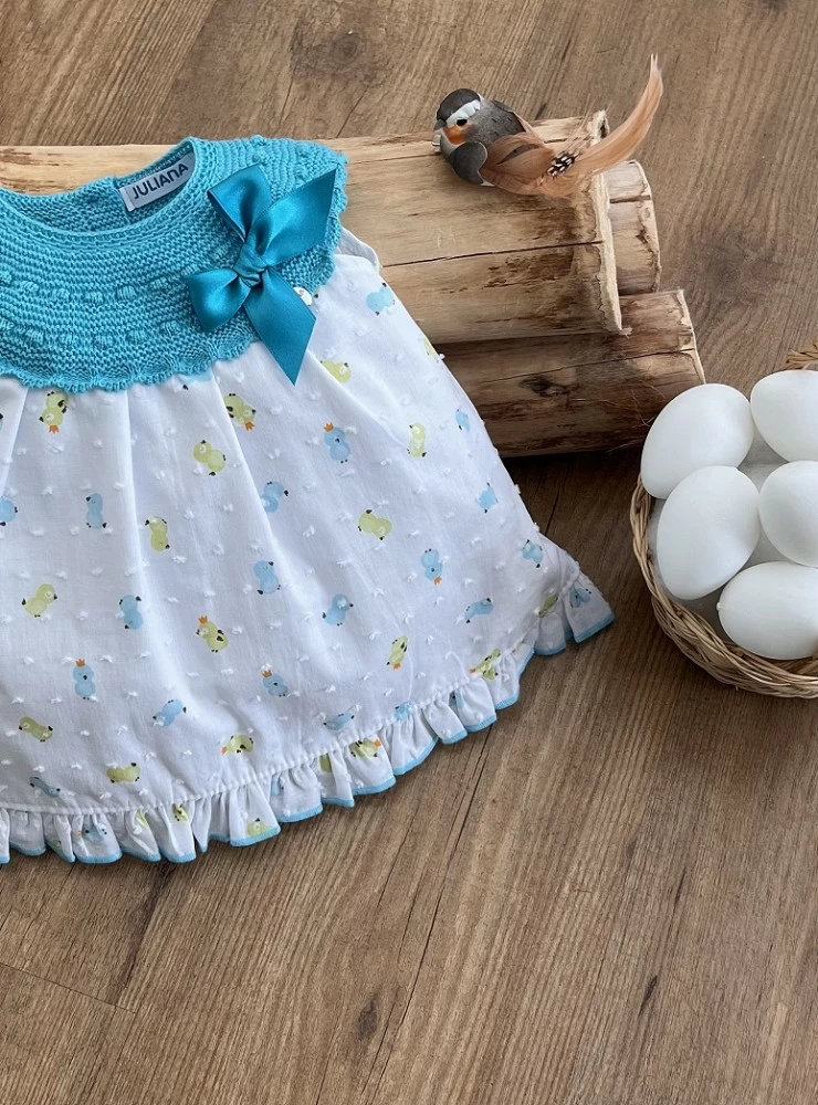 Combina cuerpo de punto finito color turquesa con falda de plumeti estampado pollitos.