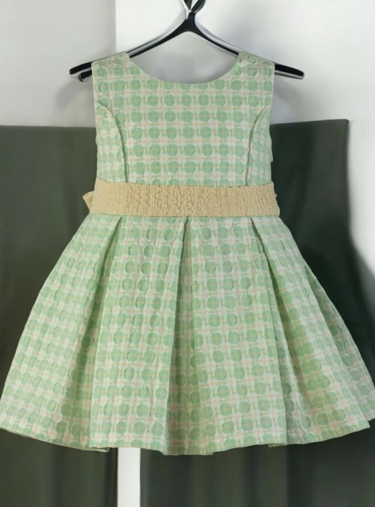 Vestido especial ceremonia y vestir. Tejido satinado en círculos verde agua con arena. Es sin mangas y tableado con un bonito lazo en la espalda. Muy bonito para cualquier ocasión