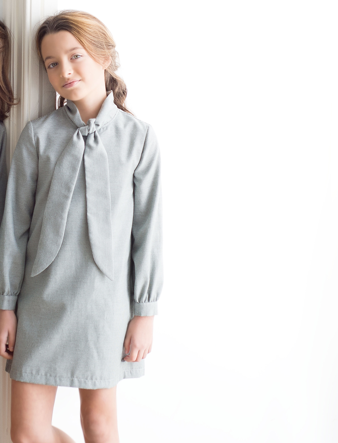 Confeccionado en un tejido suavecito con estampado pata de gallo pequeñito en color verde botella. Lleva en el cuello un lazo grande como detalle. Es un vestido modelo original de eve.