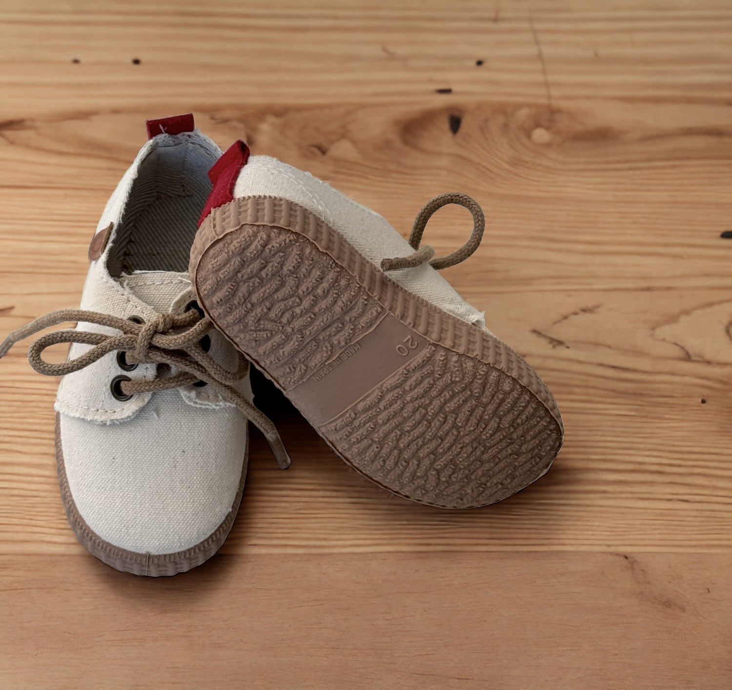 Confeccionada en lino color beige con suela de goma y cordones color arena. Son unas zapatillas muy cómodas y útiles con un diseño chulisimo especial vestir.